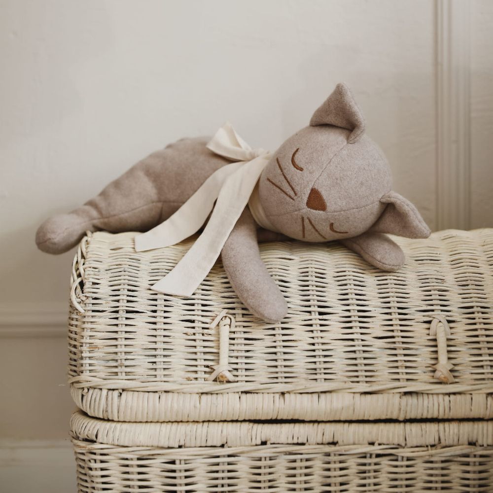 Wykonana z miękkiej, przyjaznej dla skóry bawełny organicznej, jest bezpieczna nawet dla najmłodszych dzieci. Subtelne detale, takie jak haftowane oczka, delikatne wąsiki i urocza kokarda na szyi, nadają jej wyjątkowego uroku i ponadczasowego charakteru.