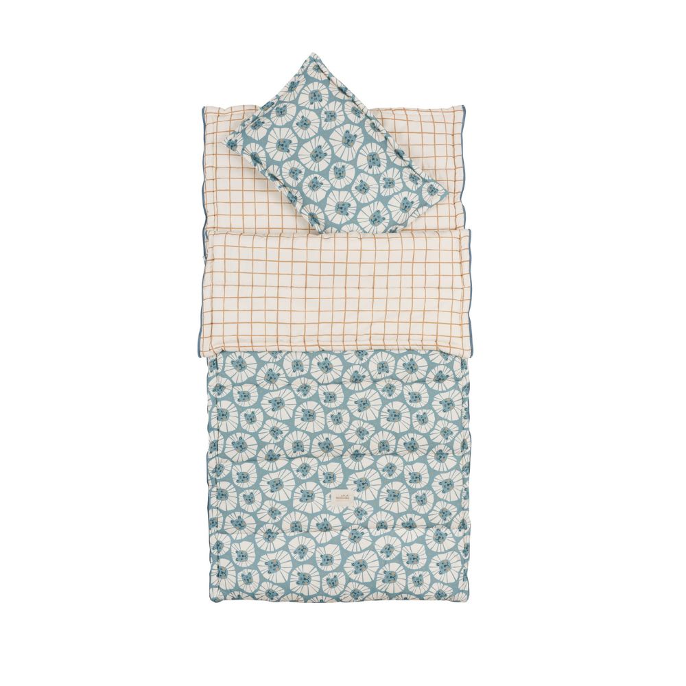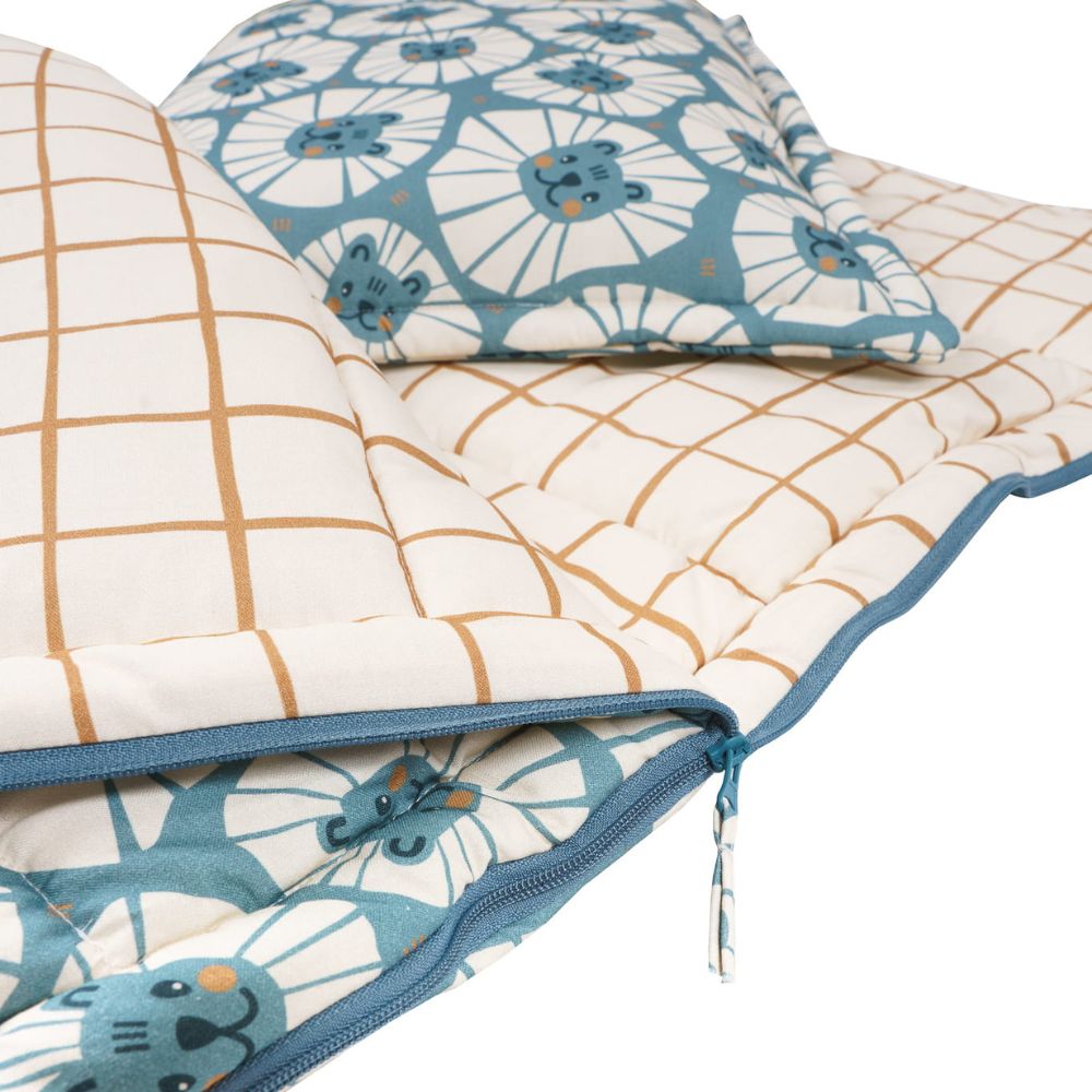Zestaw do spania Malomi Kids: śpiworek z poduszką – Denim Lions