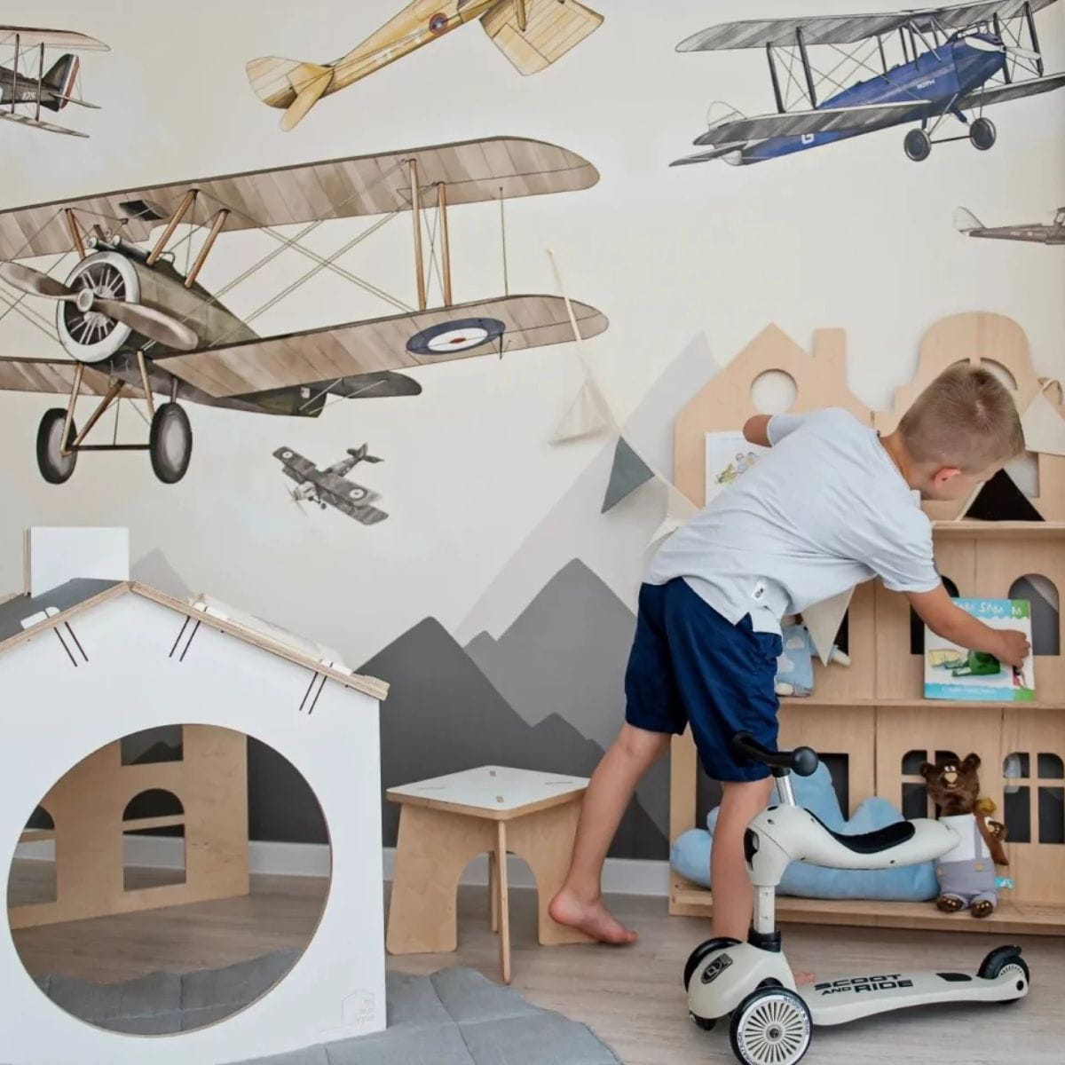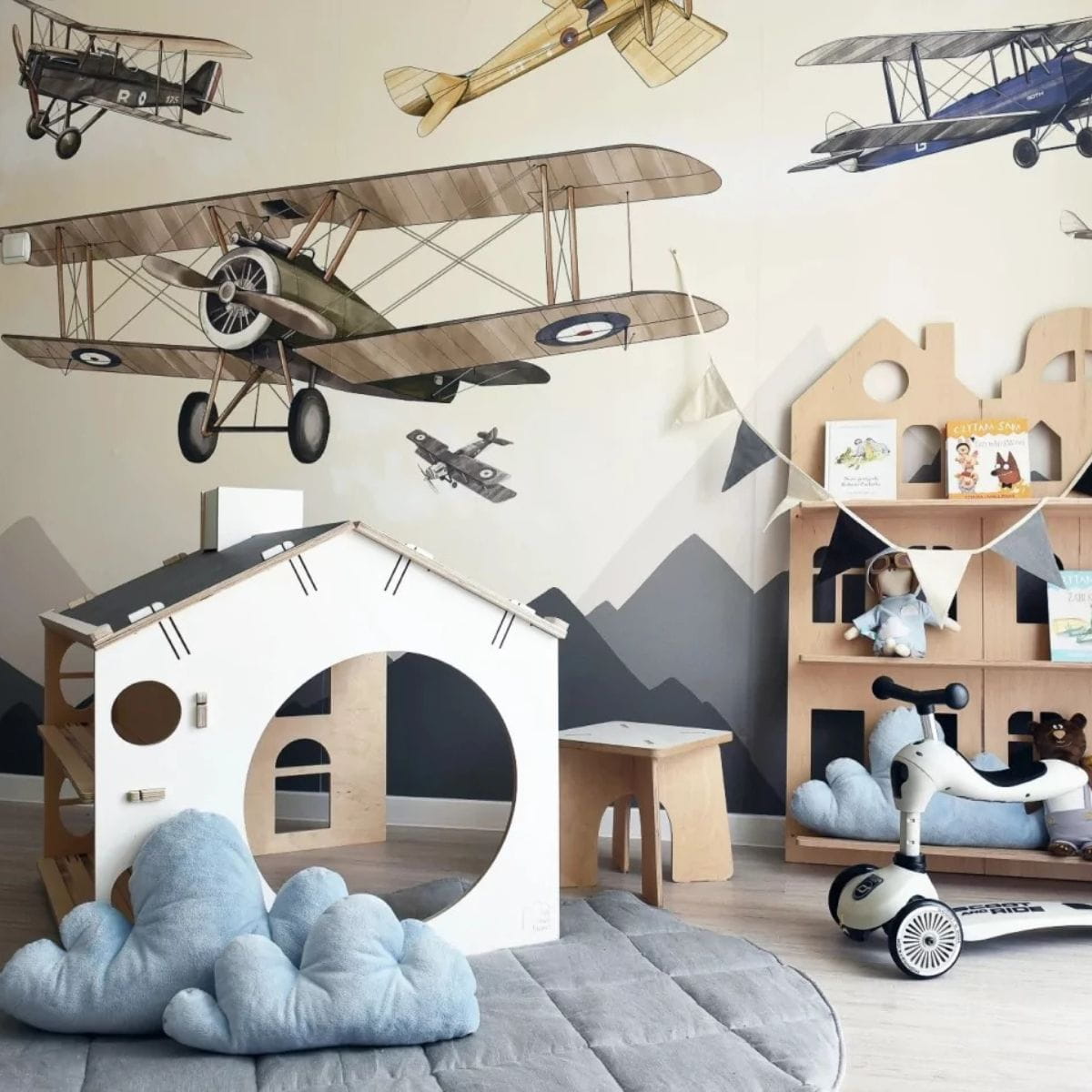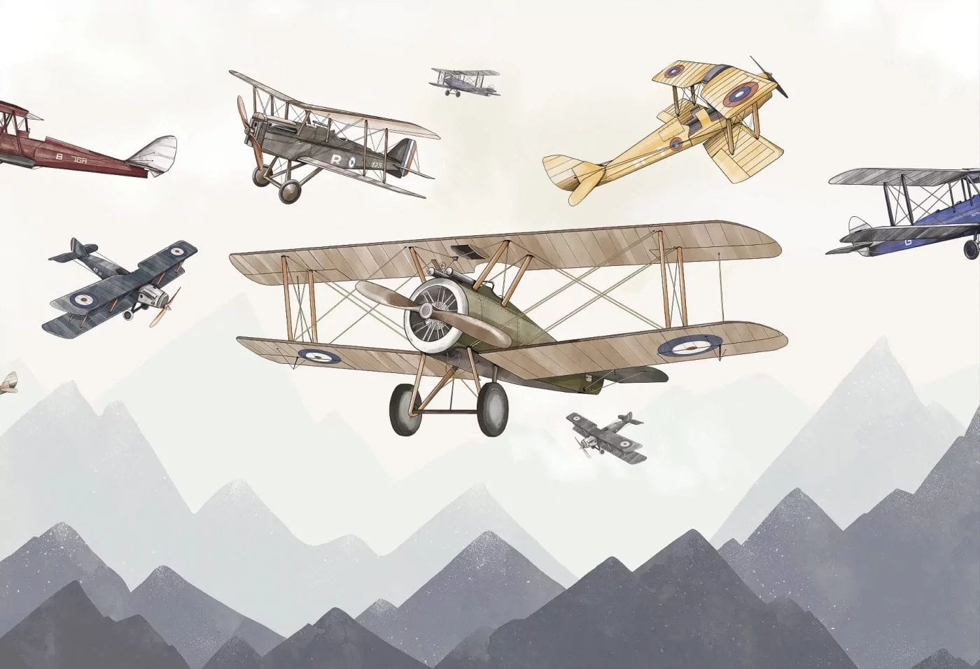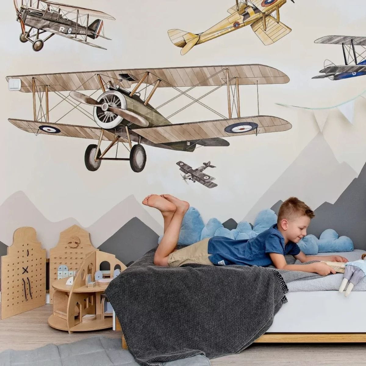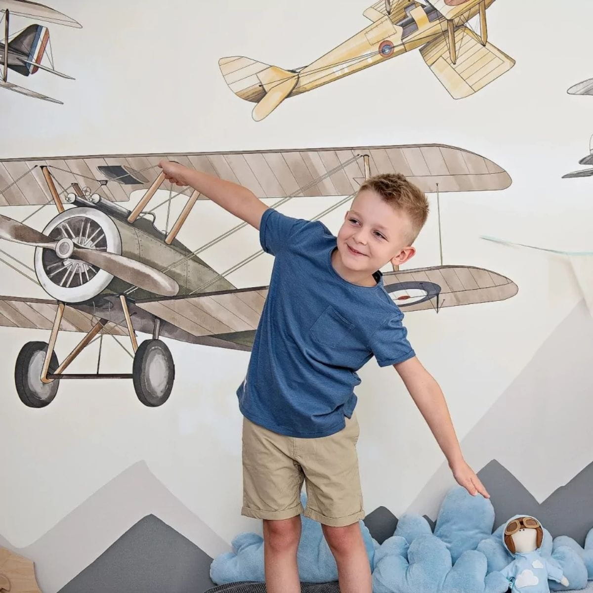 Góry są zobrazowane schematycznie, mogą z powodzeniem wyglądać zza niskich szafek i dziecięcych regalików oraz skrzyń na zabawki. Pociecha ma wówczas pełen dostęp do swoich rzeczy i może miło spędzać czas w pokoju. Tapeta samoloty będzie idealnie komponowała się z drewnem, kolorami ziemi i harmonijnym wyposażeniem pokoju.