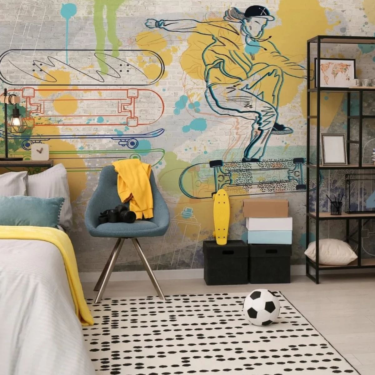 Tapeta do pokoju nastolatka Skatepark to świetne rozwiązanie dla każdego fana deskorolek. Dynamiczny obraz i żywe kolory świetnie sprawdzą się w pokoju starszego dziecka. Tapeta z deskorolkami będzie pięknie prezentowała się w pokoju chłopca.
