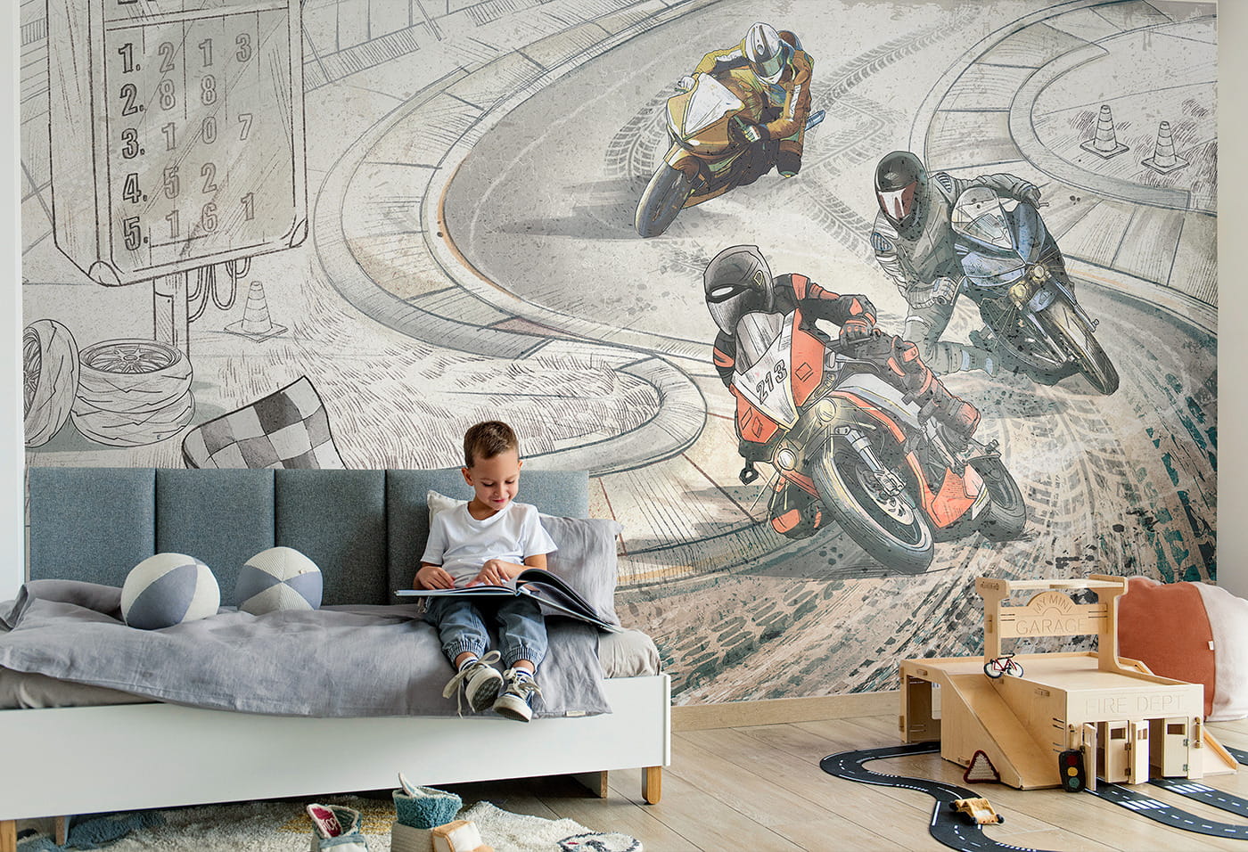Niezwykła fototapeta z motocyklami i torem wyścigowym to propozycja idealna dla chłopców. Świetny wzór dla fanów adrenaliny i motoryzacji.
