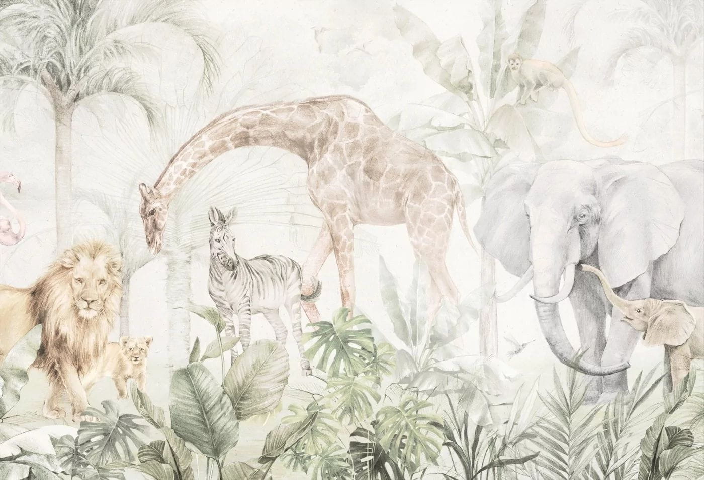 Tapeta dżungla w pięknych delikatnych odcieniach to propozycja na ścianę do pokoju dziecka praktycznie w każdym wieku. Przepiękny mural safari ze zwierzętami wśród bujnej roślinności to motyw, który pięknie ozdobi dziecięce wnętrze. Delikatne barwy sprawiają, że tapetę bardzo łatwo będzie dopasować do mebli oraz pozostałych elementów wyposażenia.
