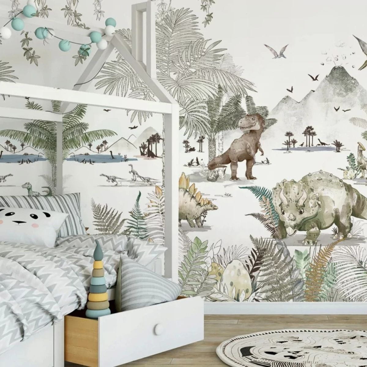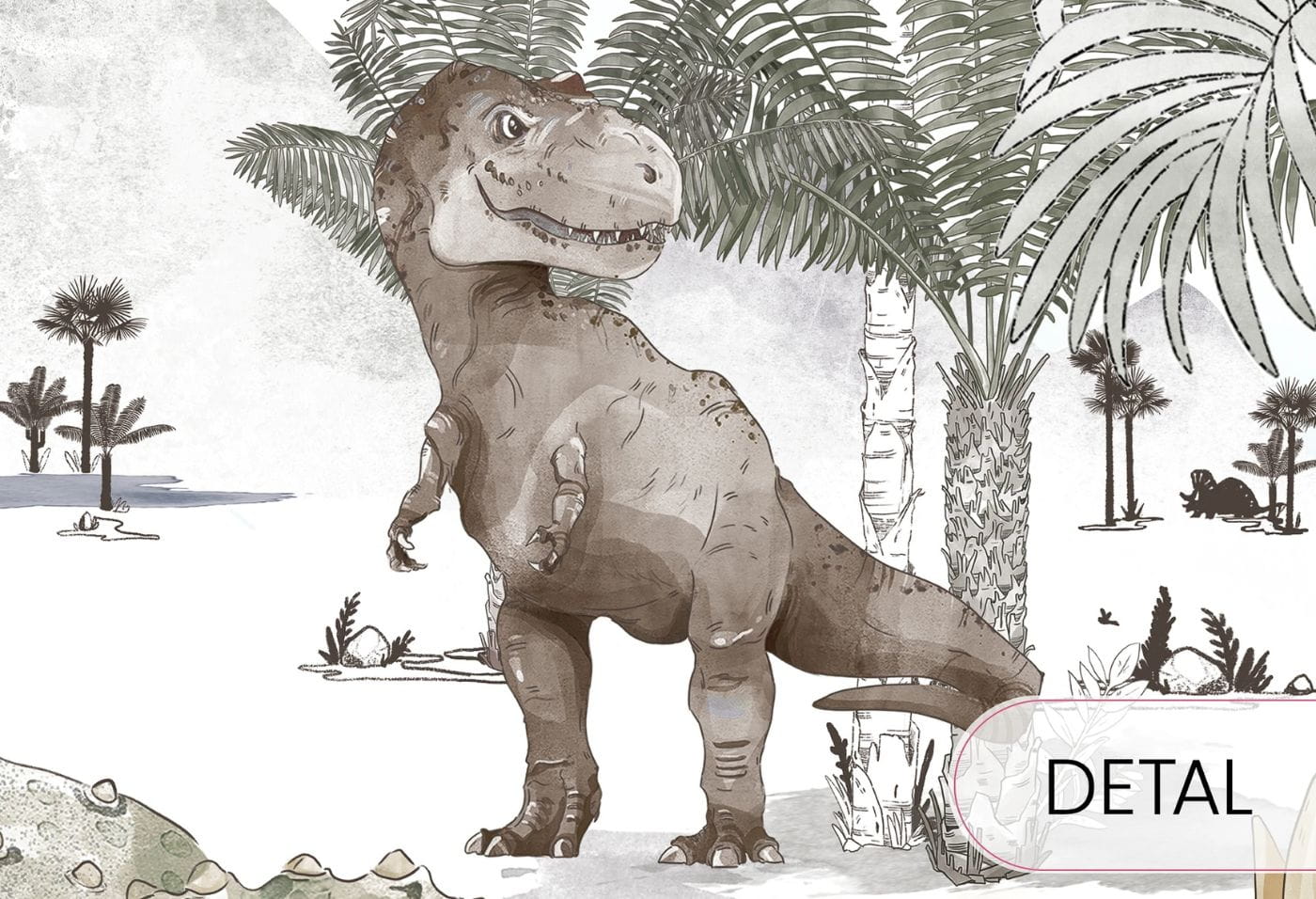 Triceratops, tyranozaur, dinozaury roślinożerne i latające po niebie, wielkie palmy i paprocie, zielone pnącza. Wszystko to narysowane specjalnie dla Malumi przez utalentowaną ilustratorkę, z zachowaniem proporcji w przyjemnej kolorystyce. Mural z dinozaurami może wypełnić całą ścianę tworząc prehistoryczny klimat we wnętrzu. Znajdziecie tu wiele tematów do wspólnych rozmów. Wraz z atlasem rozpoznacie gatunki. Codziennie odkryjecie na nowo poszczególne scenki. To wspaniały pretekst do rozmów o rozwoju ziemi!