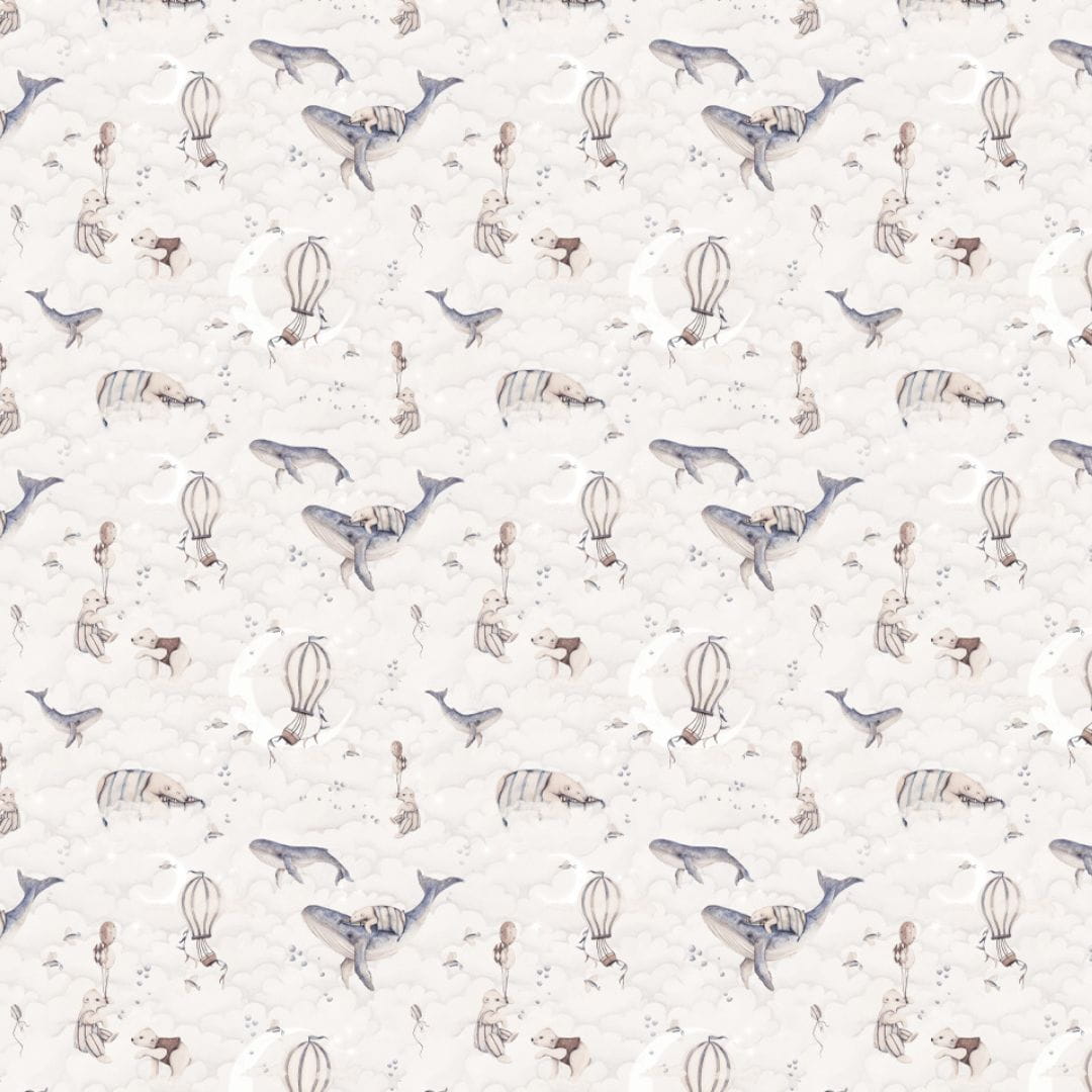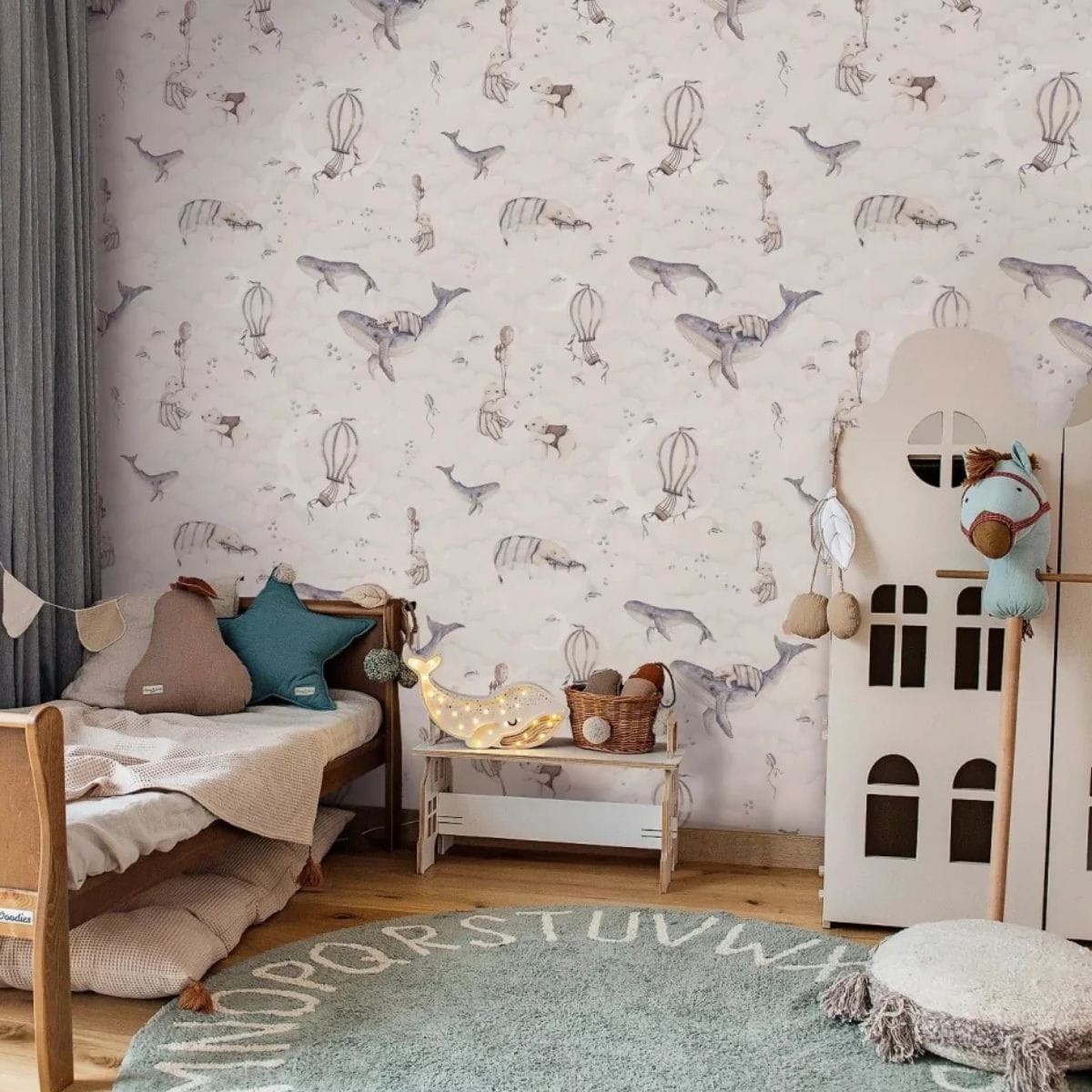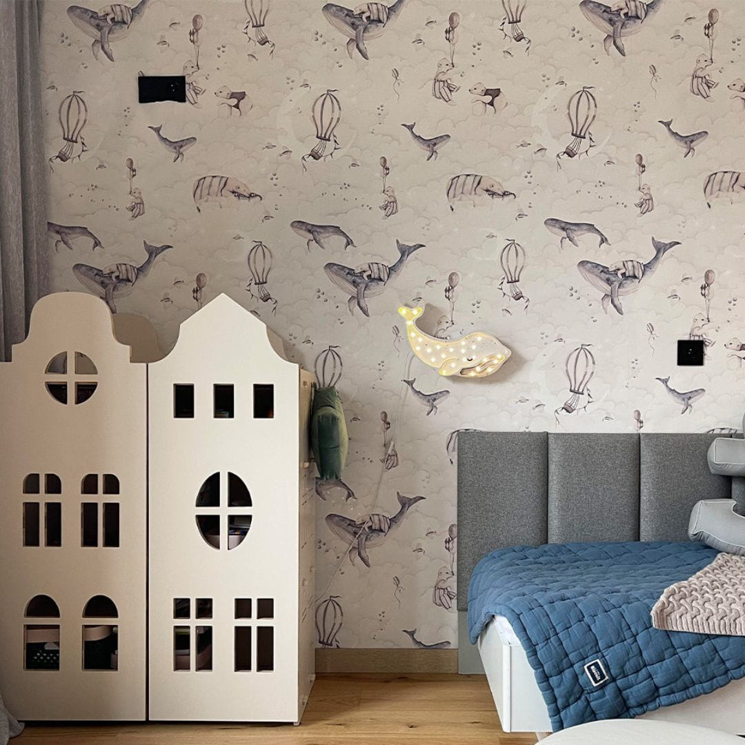 Niezwykle oryginalna tapeta do pokoju dziecka w misie i wieloryby. Bardzo delikatna, świetnie pasuje do pokoju chłopca, jak i dziewczynki.