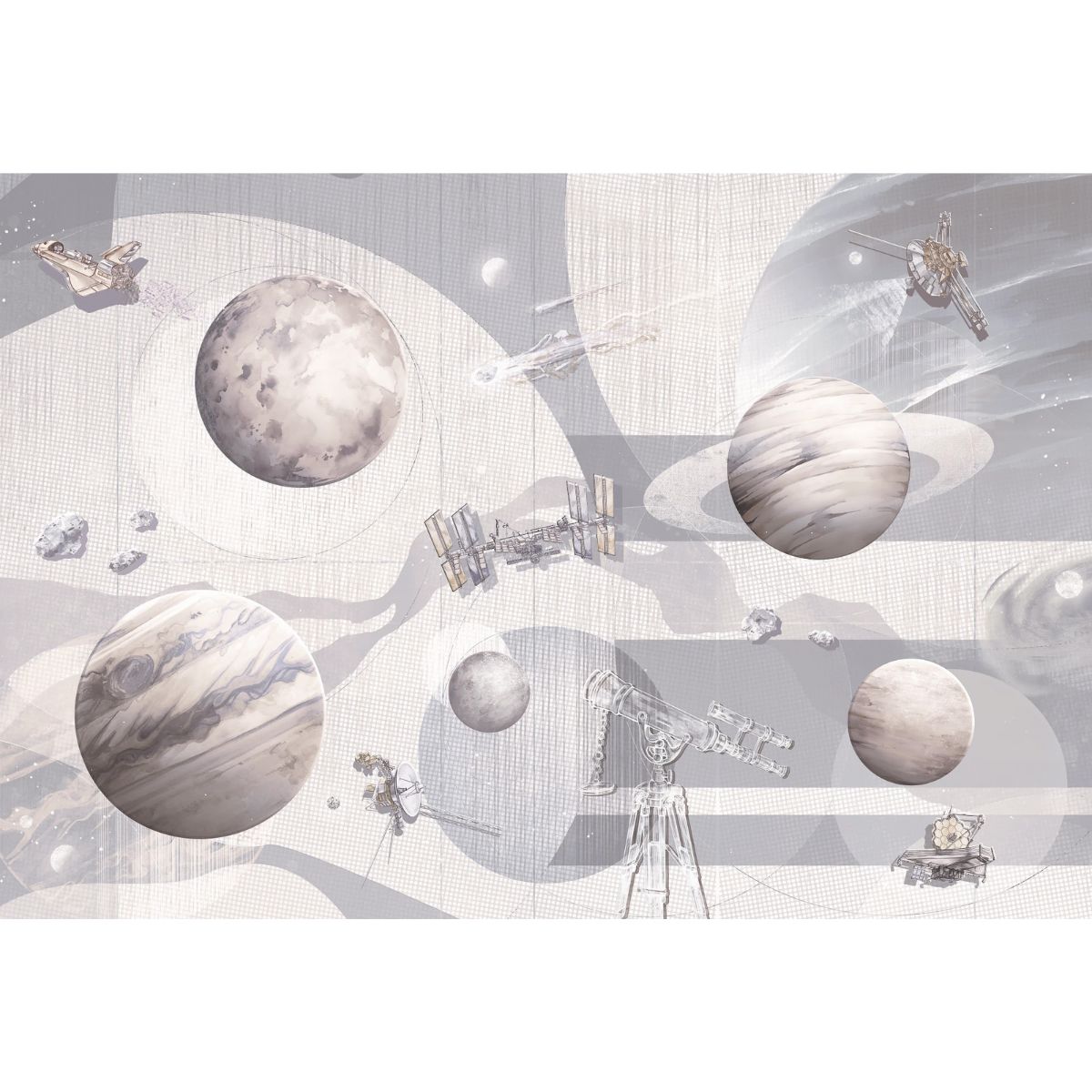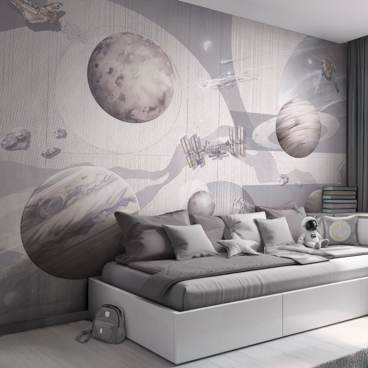 Space Zone Milky to tapeta, która zamienia zwykły pokój dziecka w bazę małego astronauty – miejsce pełne marzeń, inspiracji i nieskończonych galaktycznych przygód.