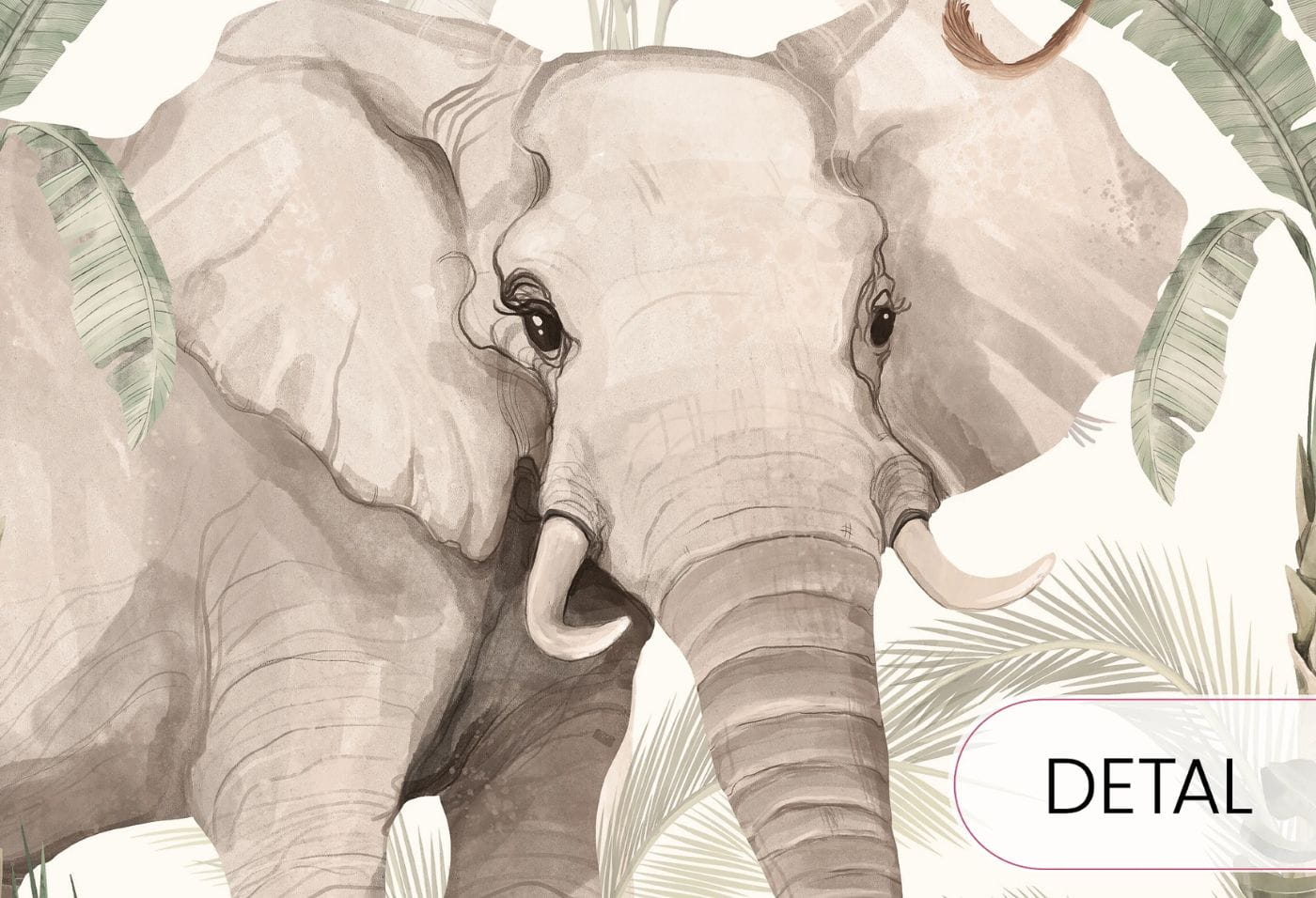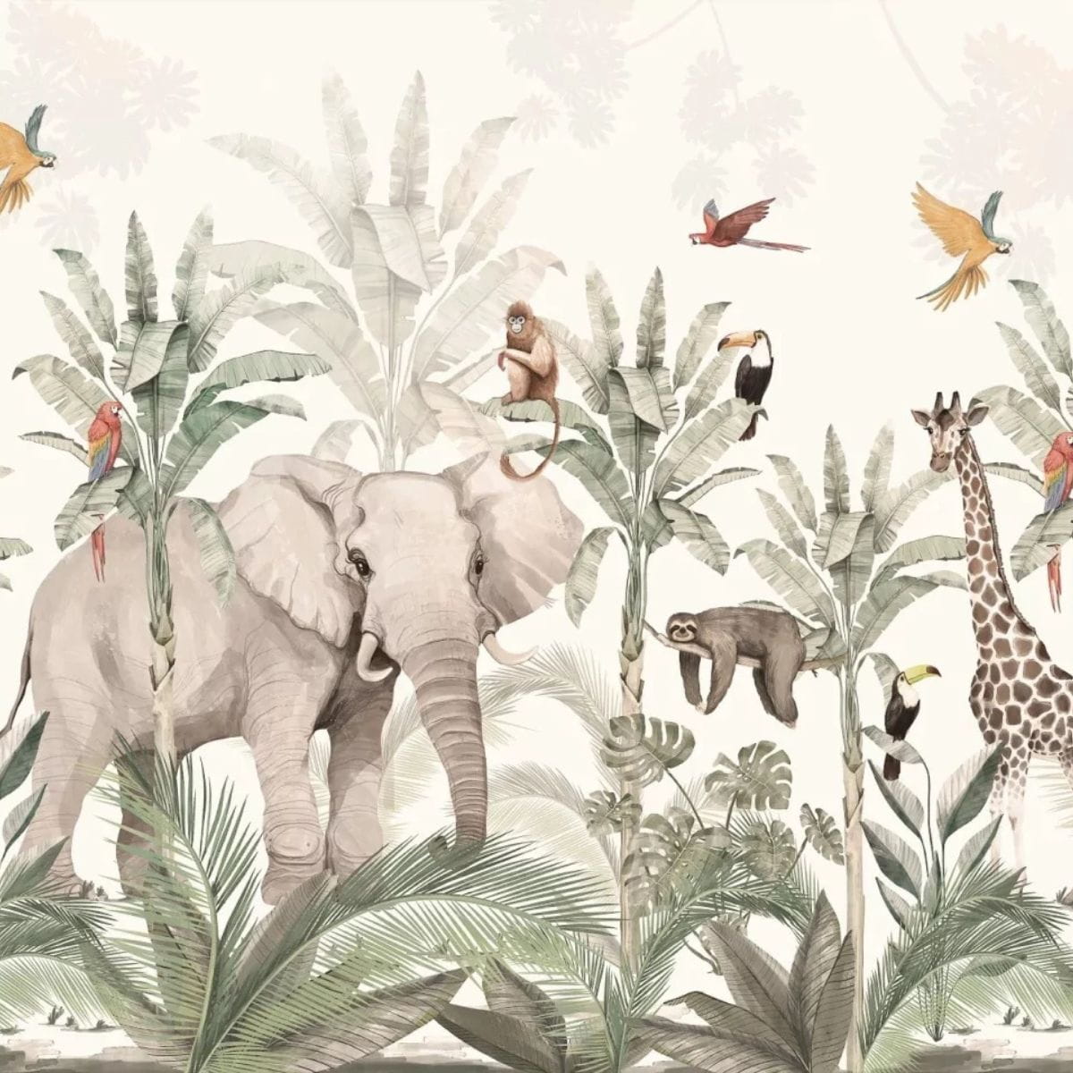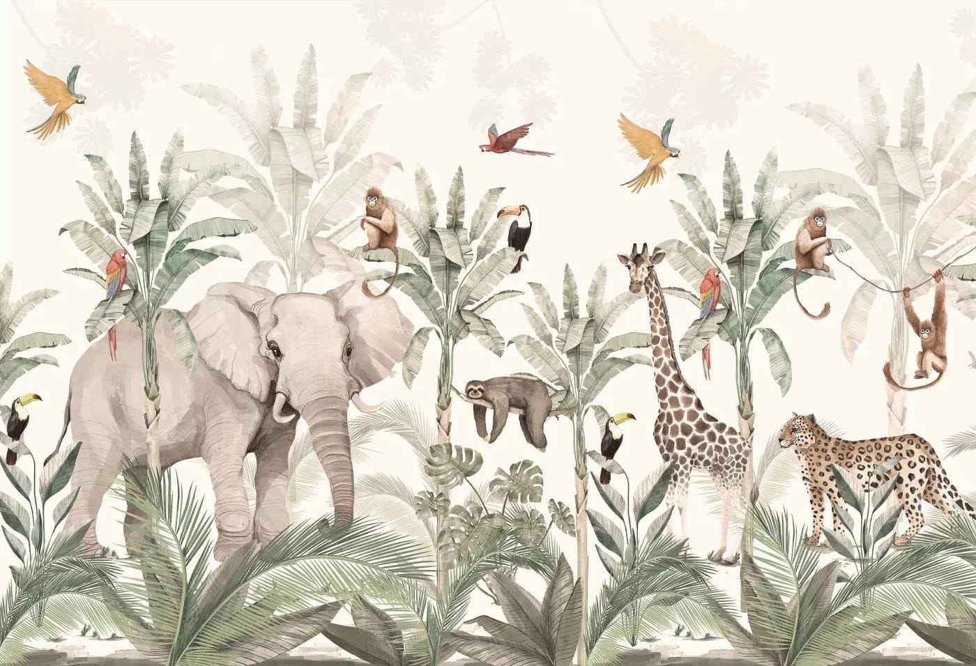 Tapeta Jungle w delikatnych ciepłych kolorach stworzy namiastkę dżungli w pokoju Twojego dziecka. Na tapecie umieszczone są uwielbiane przez wszystkie dzieci dzikie zwierzęta: żyrafa, słoń, jaguar, papugi w otoczeniu tropikalnego zielonego lasu.