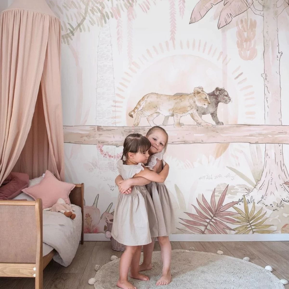 Tapeta safari z lwem do pokoju dziewczynki – kolorowa przygoda w bajkowym stylu