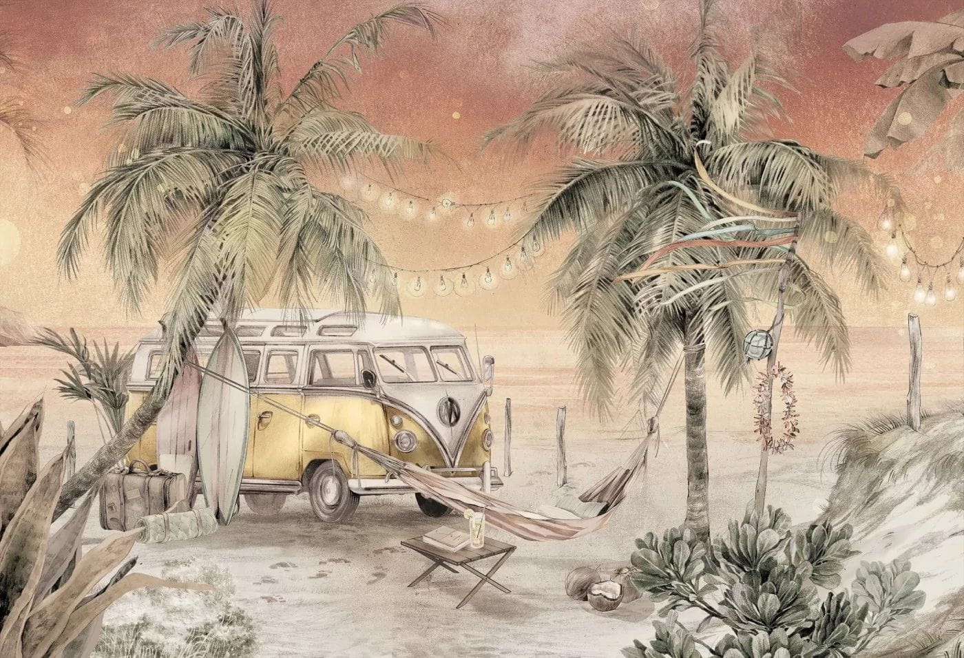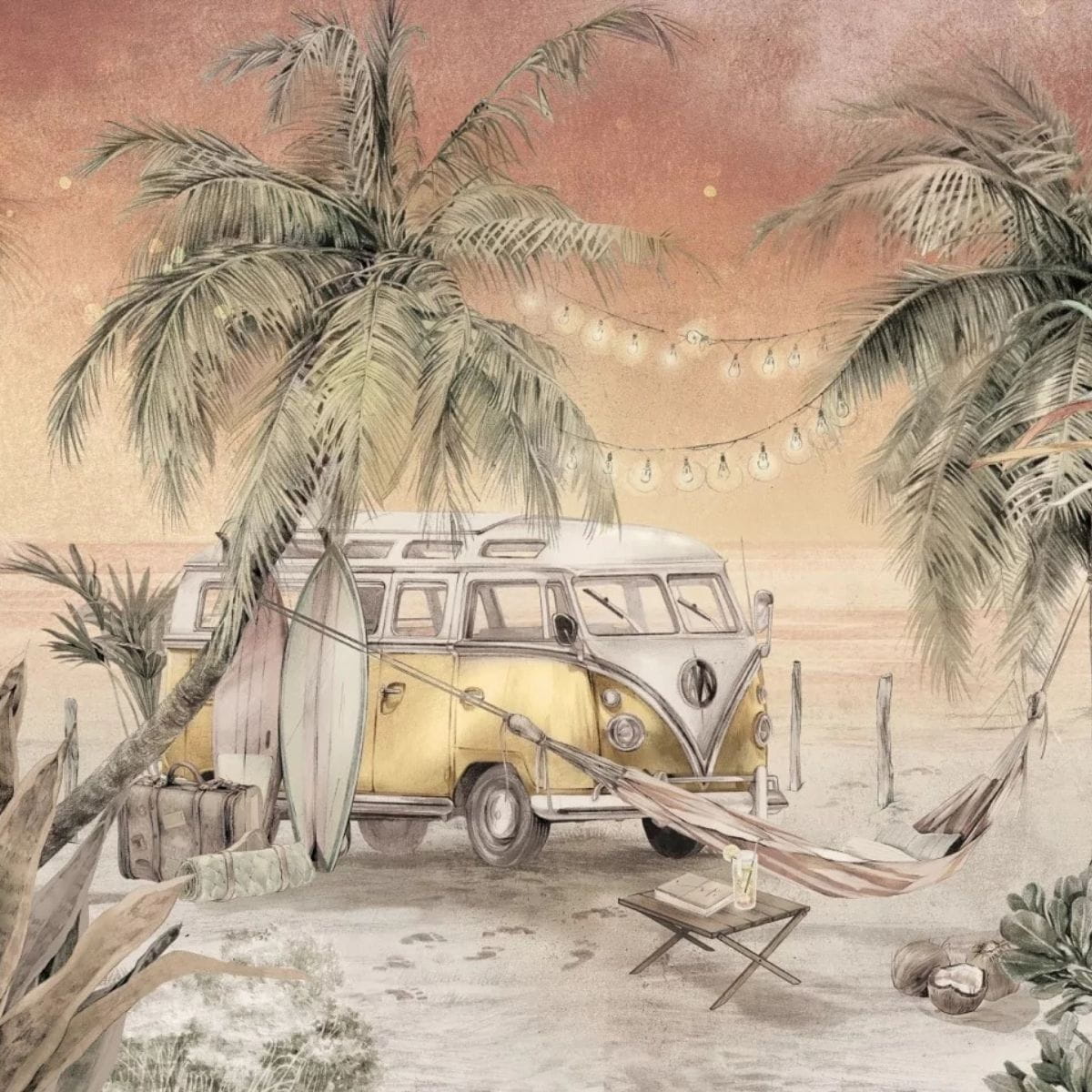 Niezwykła tapeta dla dzieci Surf Camp przywoła najlepsze, wakacyjne wspomnienia! Retro van i deski surfingowe w otoczeniu palm na tle oceanu to wzór, który sprawdzi się zarówno w pokoju chłopca jak i dziewczynki. Hamak i światełka rozwieszone na palmach sprawiają, że wnętrze nabierze niezwykłego charakteru.