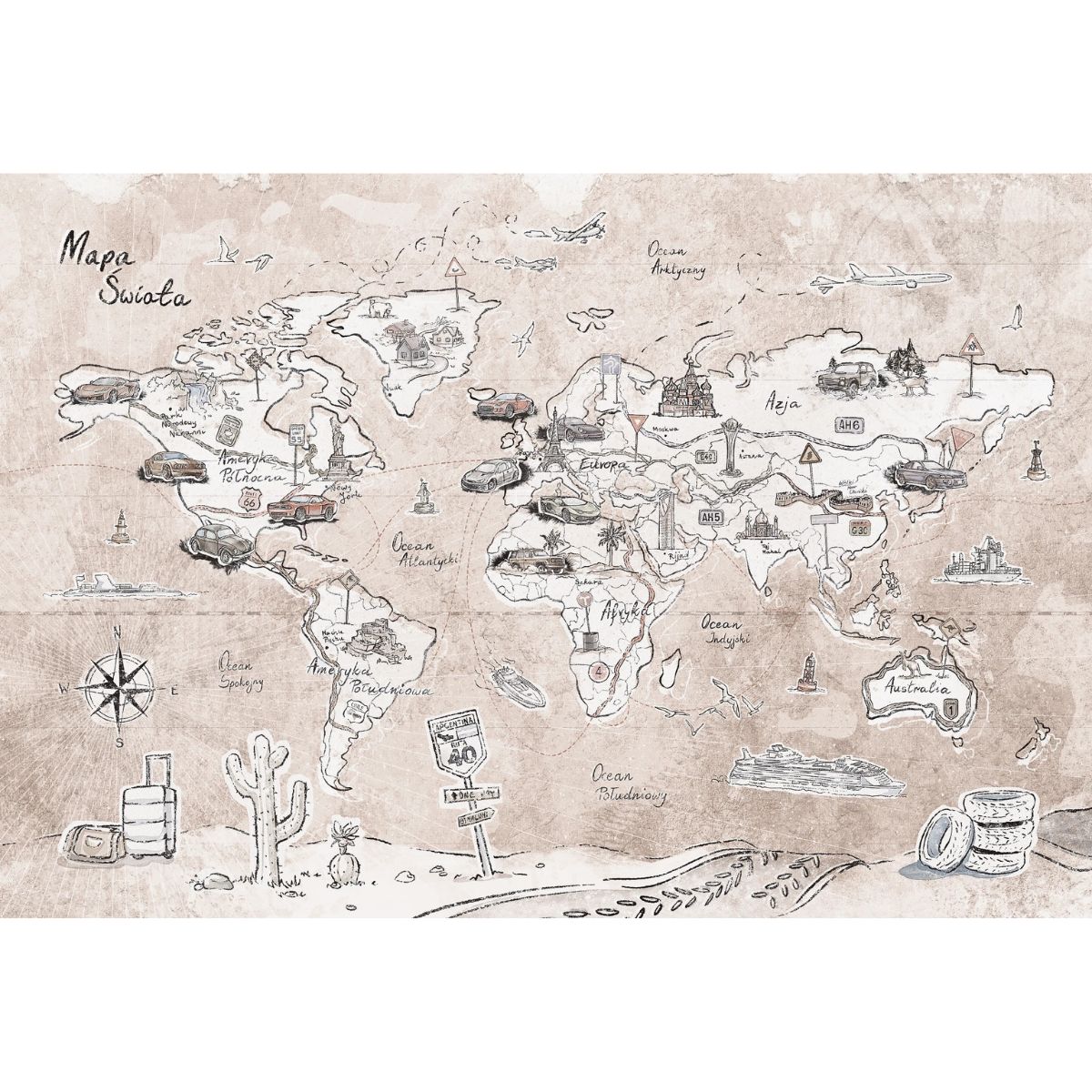Beżowa tapeta do pokoju dziecka z motywem mapy świata zachwyca subtelną, rysunkową grafiką pełną uroczych detali. Na wzorze pojawiają się samochody przemierzające lądy, statki sunące po oceanach, samoloty na niebie oraz charakterystyczne budowle z różnych zakątków świata.