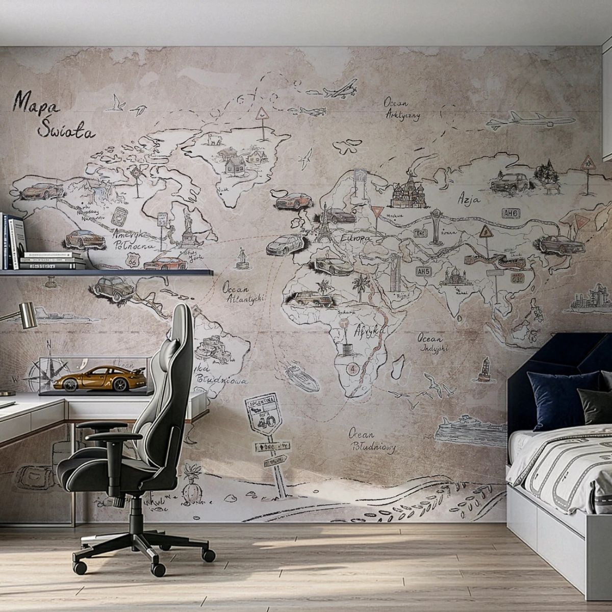 Beżowa tapeta dziecięca Trip Map Beige to zaproszenie do świata wielkich przygód widzianych oczami najmłodszych. Utrzymana w ciepłej, naturalnej tonacji wprowadza do pokoju dziecka atmosferę spokoju i wyciszenia, a jednocześnie pobudza ciekawość świata i marzenia o dalekich podróżach.