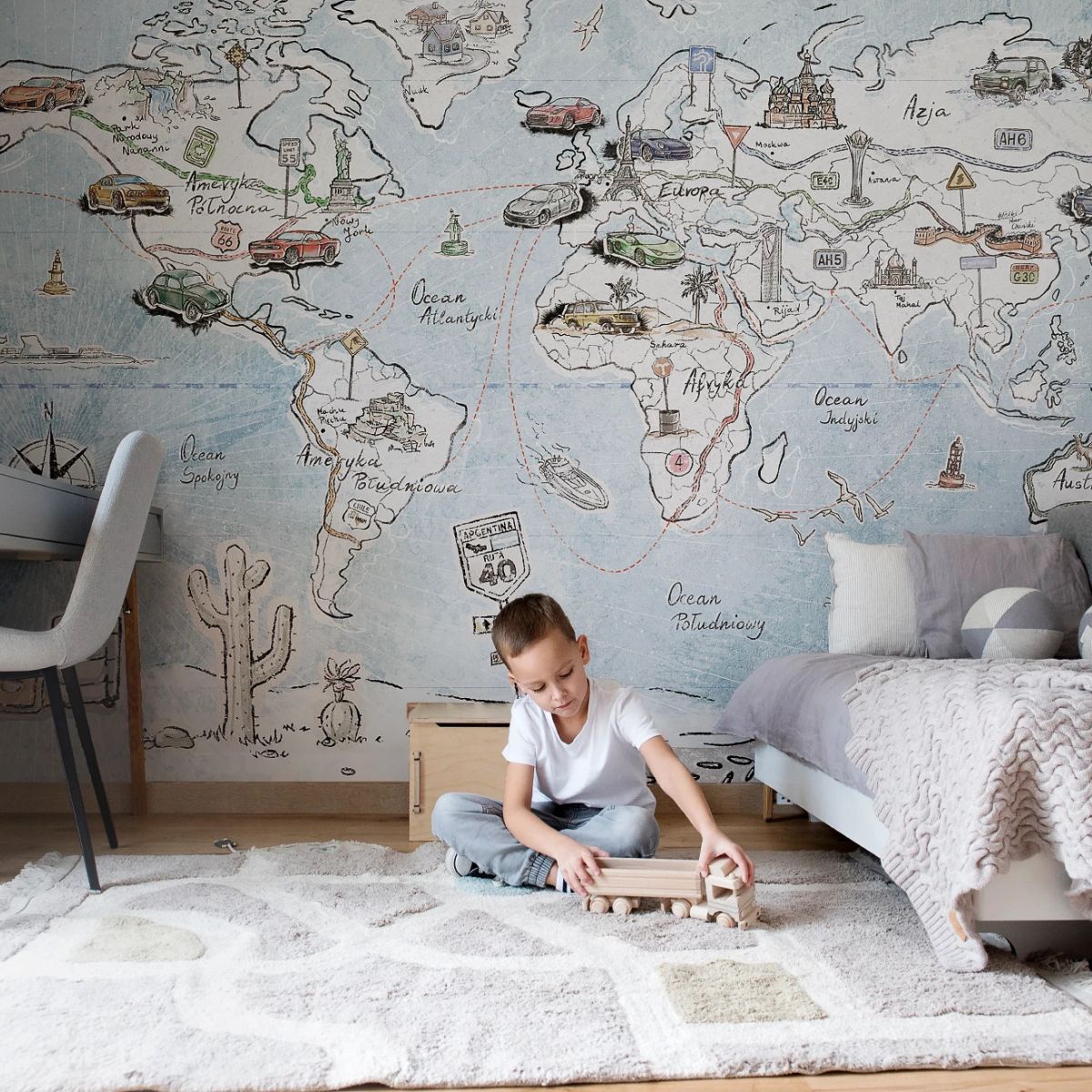 Trip Map Blue doskonale sprawdzi się zarówno w pokoju chłopca, jak i dziewczynki. To dekoracja, która rośnie wraz z dzieckiem i jego wyobraźnią. Wprowadza do wnętrza atmosferę przygody, wolności i dziecięcej radości. Dzięki niej zwykły pokój zamienia się w bazę małego podróżnika – miejsce, z którego można wyruszyć w podróż dookoła świata, nawet bez pakowania walizek.