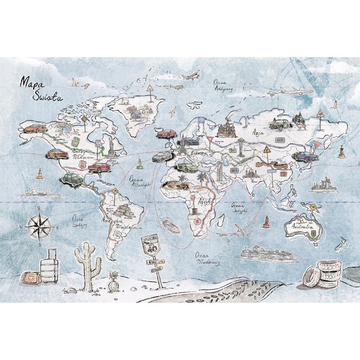 Tapeta dziecięca Trip Map Blue zachwyca ilustracyjnym wzorem przypominającym strony ulubionej książki podróżniczej dla dzieci. Samoloty przecinają niebo, statki płyną po oceanach, a samochody przemierzają kontynenty, tworząc jedną wielką opowieść o odkrywaniu świata. Na mapie pojawiają się również walizki, kompas, znaki drogowe i symbole znanych miejsc, które rozbudzają dziecięcą ciekawość oraz inspirują do zadawania pytań o różne zakątki świata.