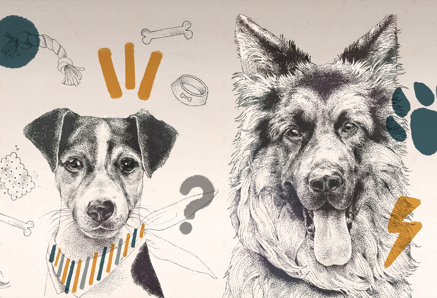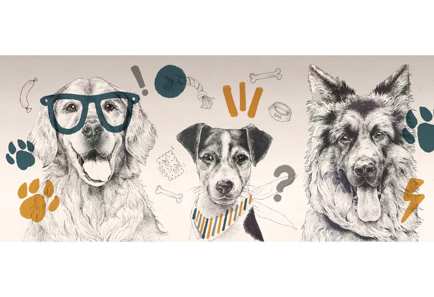 Pieski na tapecie są bardzo realistyczne, dzięki temu tapeta sprawdzi się nie tylko w pokoju malucha, ale także większego dziecka. Wzór przedstawia trzy różne rasy psów na delikatnym beżowym tle z musztardowymi detalami.