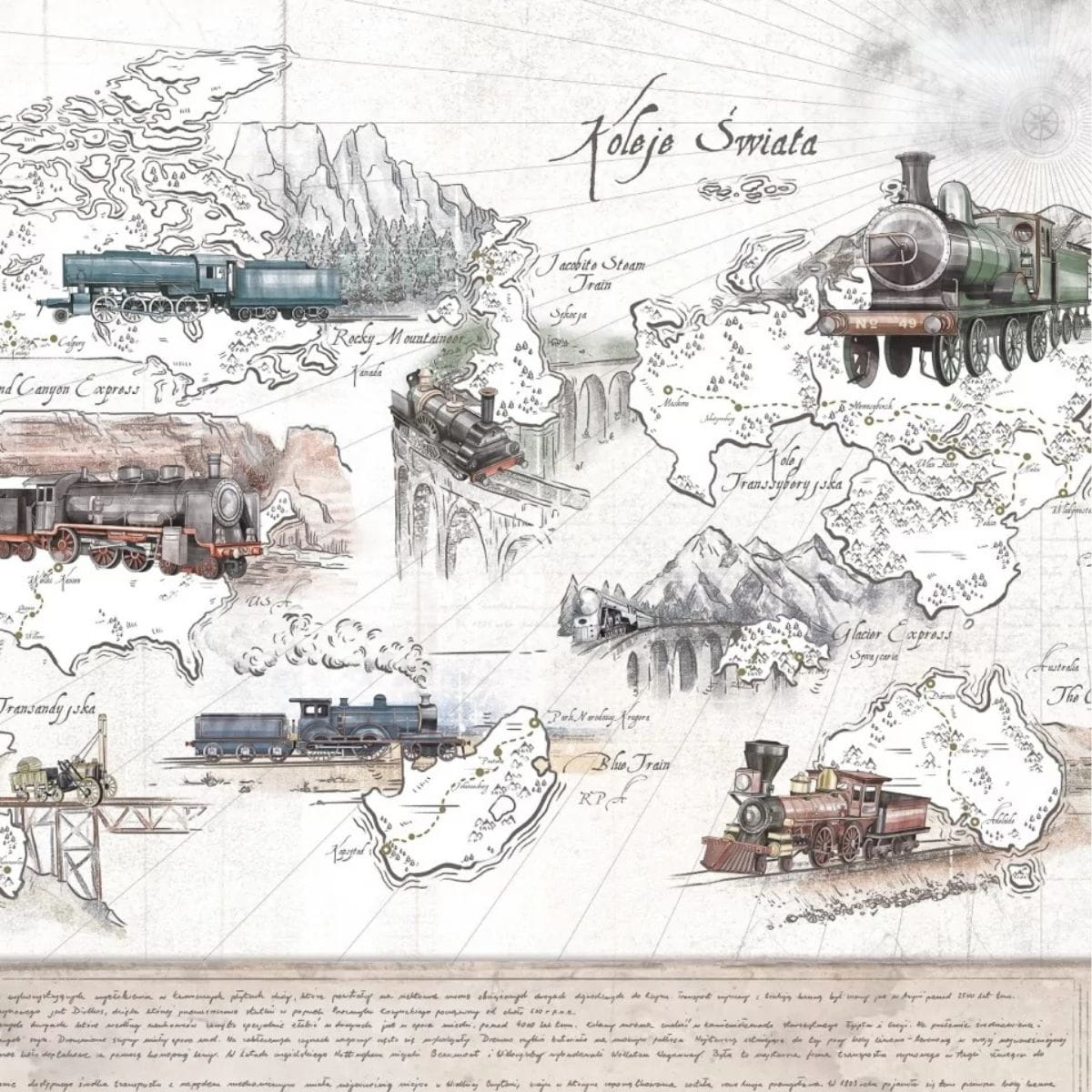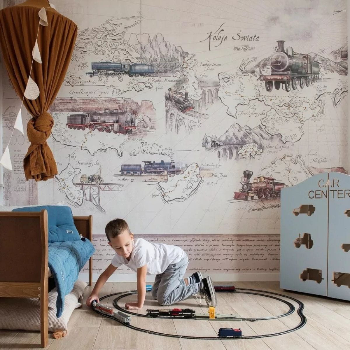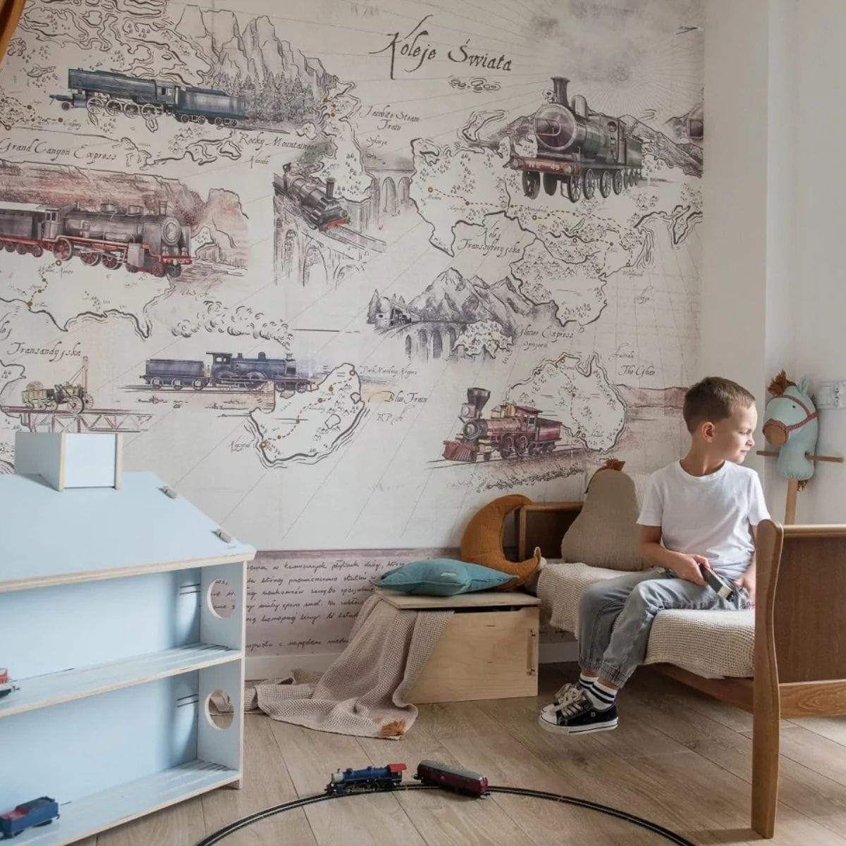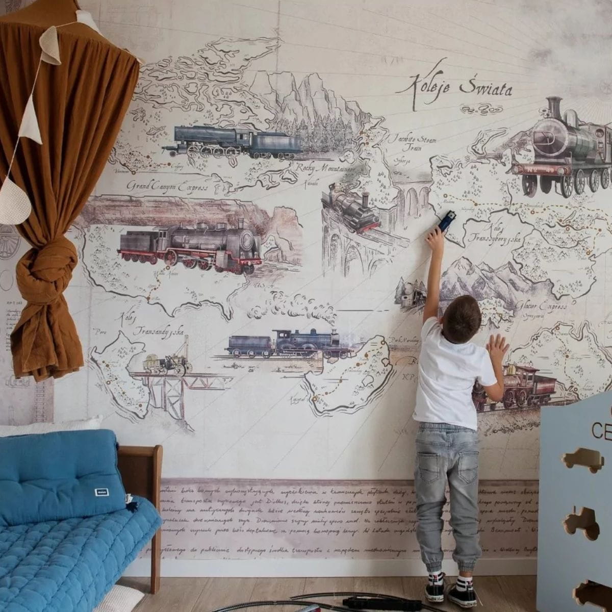 Twoje dziecko interesuje się pociągami? Jeśli tak, to mamy dla Ciebie idealną dekorację ściany! Pociągi umieszczone na retro mapie z pewnością skradną serce każdego miłośnika kolei.