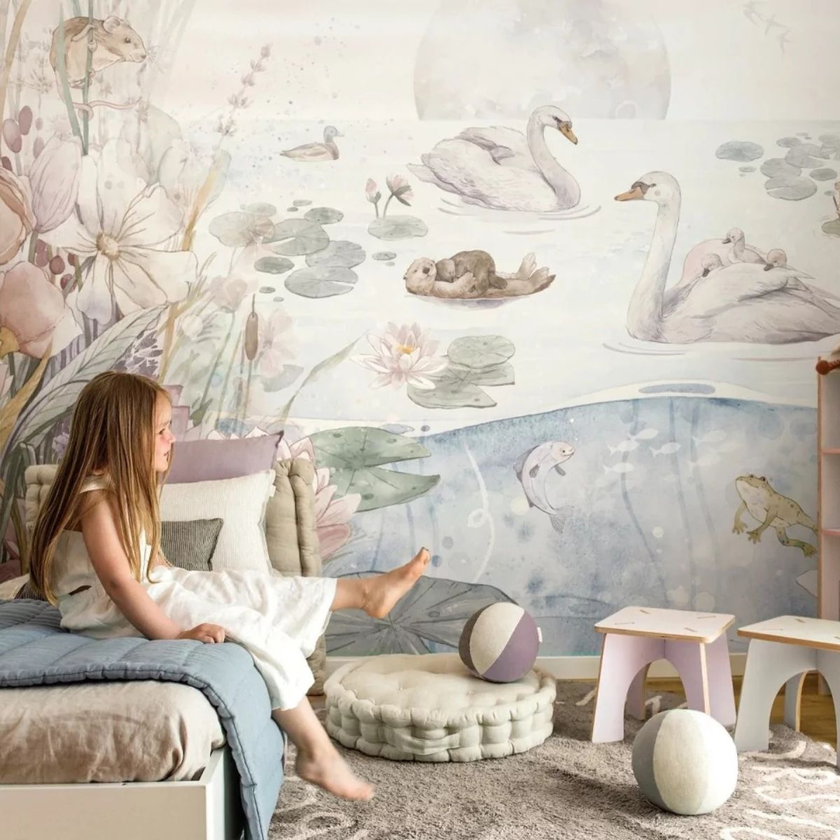 Zanurz się w bajkowej scenerii, która ożywi pokój Twojej córki i przeniesie ją w świat sielskich przygód. Ręcznie malowany wzór łączy w sobie trzy harmonijne plany: rozświetlone słońcem niebo usiane miękkimi obłoczkami, spokojną taflę jeziora z majestatycznie pływającymi łabędziami oraz urokliwy podwodny zakątek pełen subtelnych roślin, rybek i delikatnych bąbelków unoszących się ku powierzchni. Z boków kompozycji rozkwitają pastelowe kwiaty, które dodają całej scenie romantycznego i dziewczęcego charakteru.