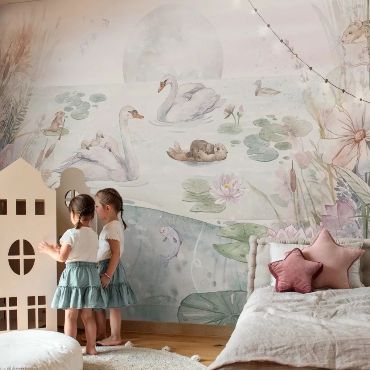 Ta bogata w detale, kolorowa tapeta nie tylko pięknie zdobi ścianę, lecz także rozwija wyobraźnię i wprowadza do pokoju dziewczynki atmosferę spokoju, przygody i dziecięcej radości. Doskonale komponuje się z jasnymi meblami w odcieniach kremu lub bieli, a naturalne materiały – lniane zasłony czy miękkie dywany w subtelnych tonacjach – podkreślają lekkość i harmonię całości. W takim wnętrzu każdy wieczór staje się okazją do snucia własnych opowieści o podwodnych podróżach i spacerach brzegiem jeziora, a poranki zaczynają się od promiennego uśmiechu słońca witającego nowy dzień.