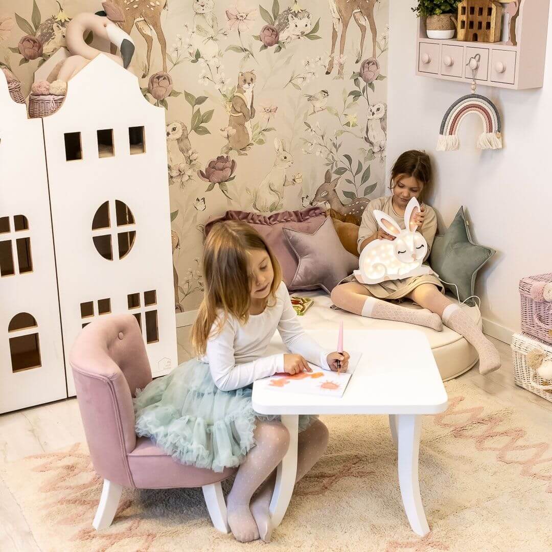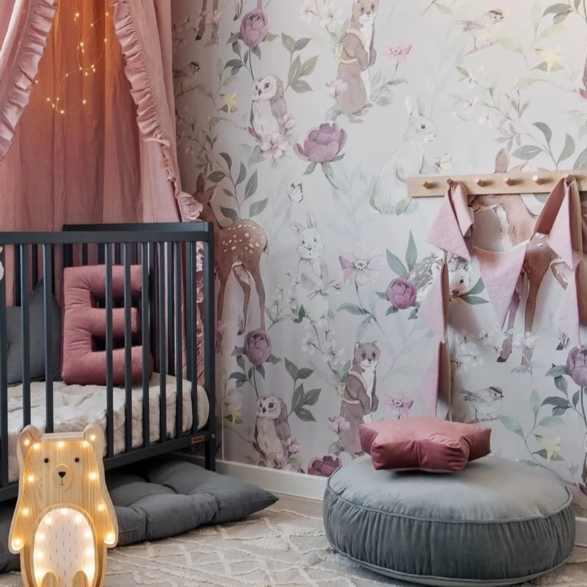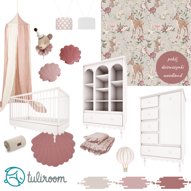 Zobacz naszą tablicę inspiracji na pokój niemowlaka dziewczynki z wykorzystaniem tapety Woodland girls