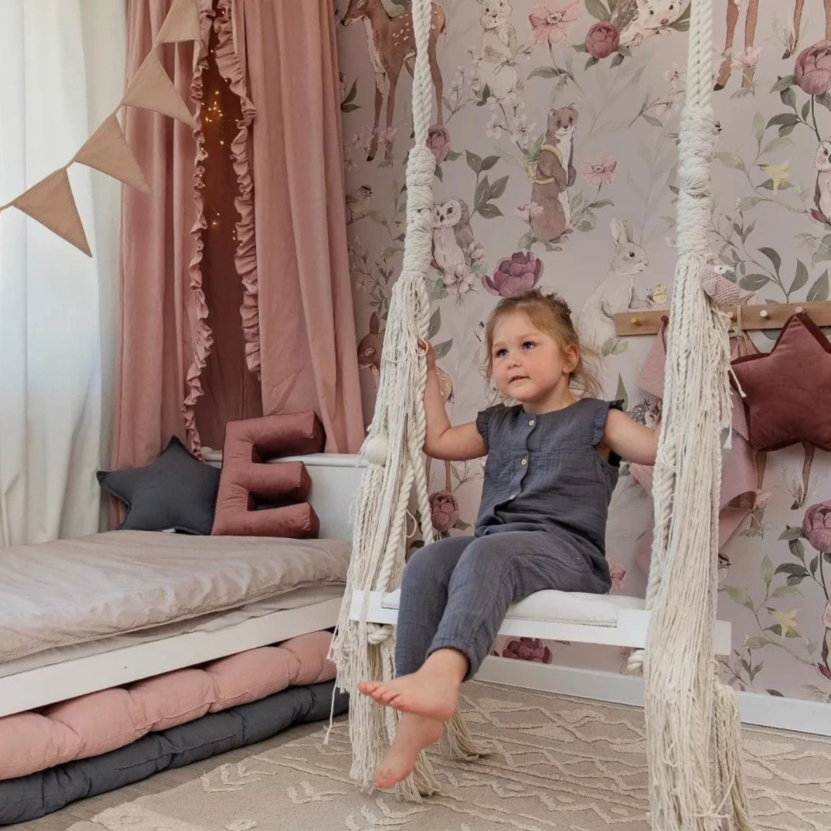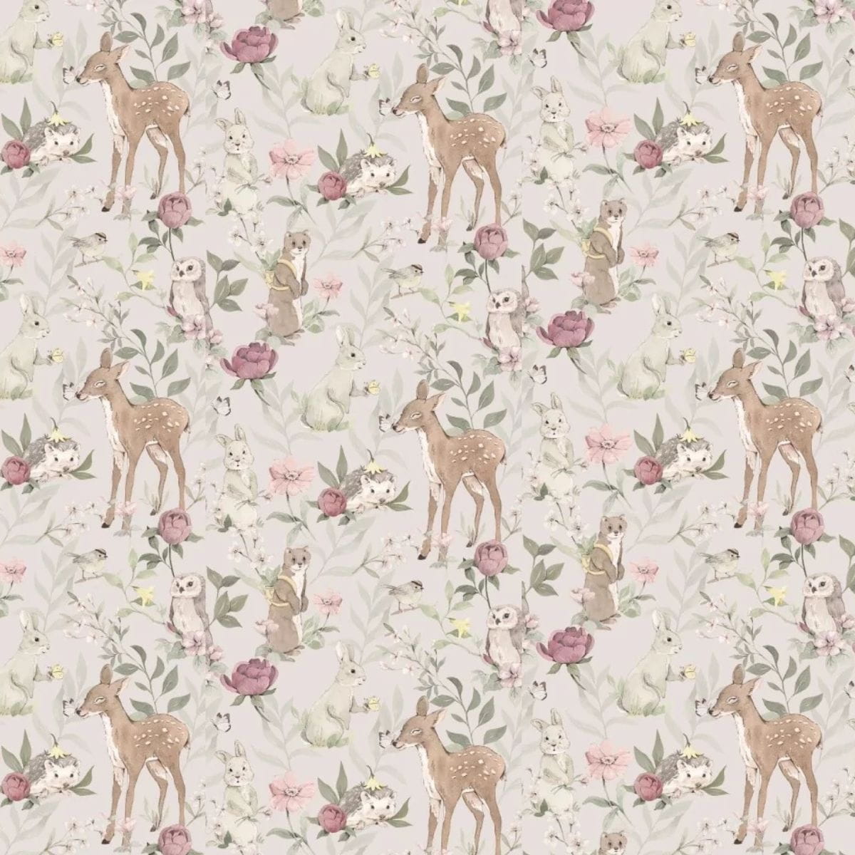 Tapeta dla dzieci Woodland to leśne zwierzątka i piękne kwiaty na szarym tle - idealna ozdoba do pokoju dziewczynki. Połącz modny trend z dziecięcą fantazją!
