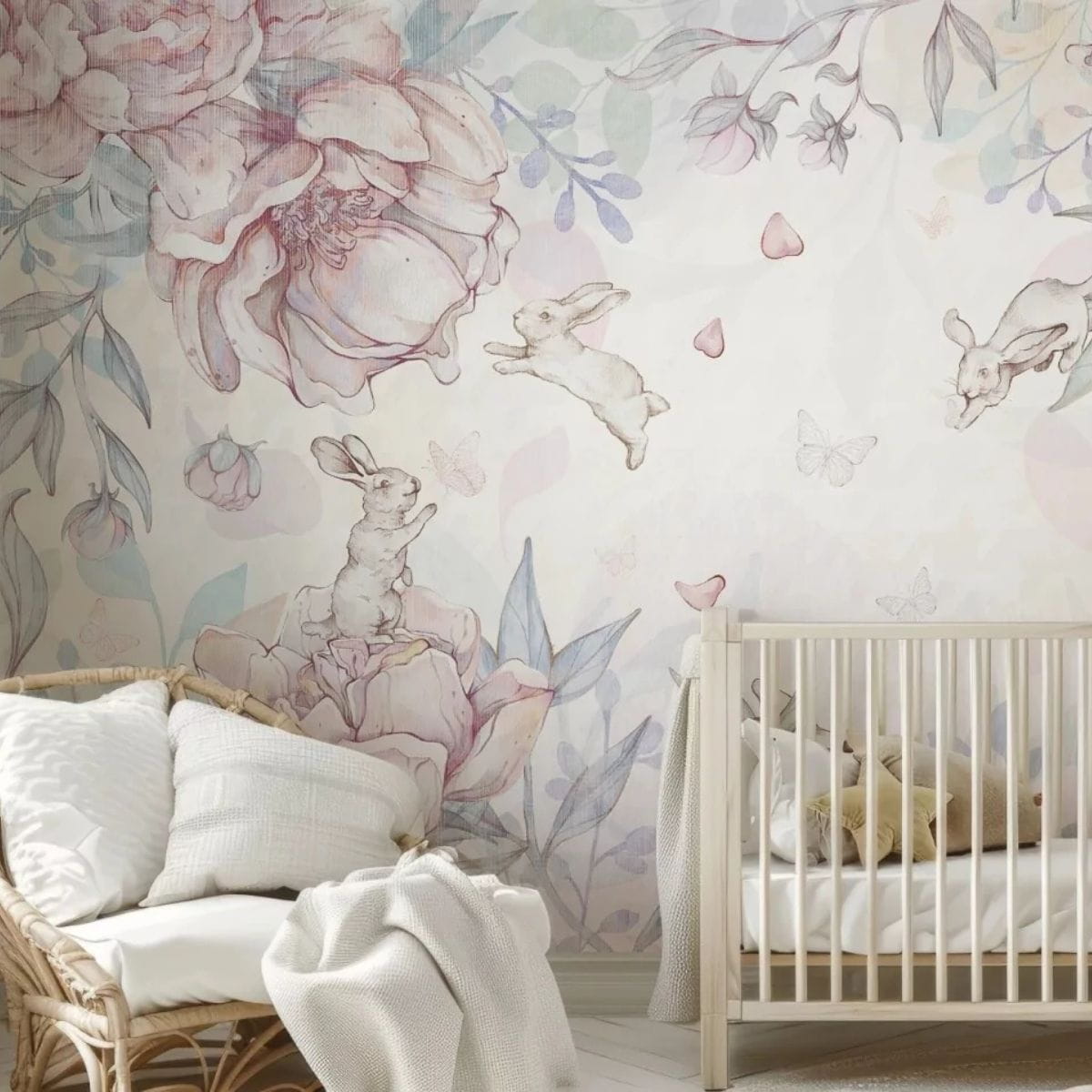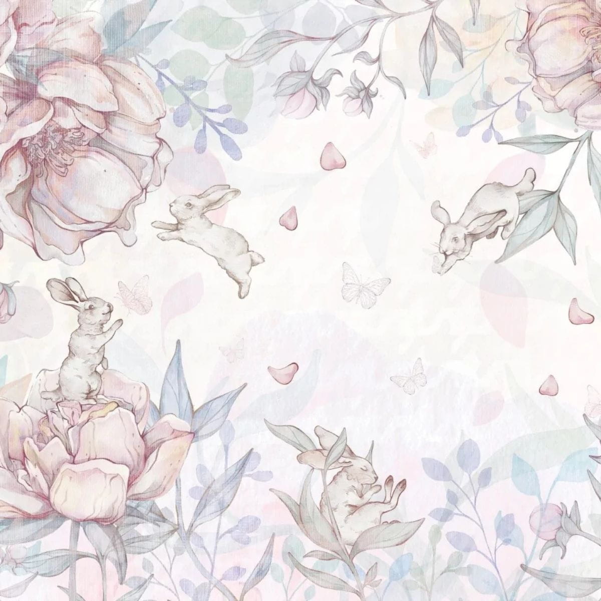 Tapeta dla dziewczynki z króliczkami i kwiatami – subtelna dekoracja do pokoju dziecięcego