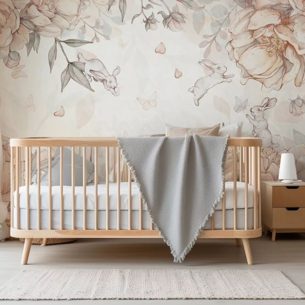 Tapeta dla dziewczynki z króliczkami i kwiatami – subtelna dekoracja do pokoju dziecięcego