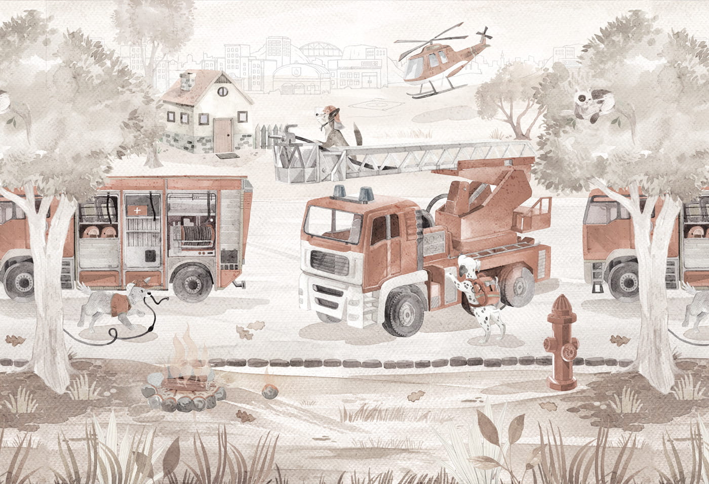 Tapeta ze strażą pożarną i uroczymi pieskami z pewnością będzie idealnym rozwiązaniem dla każdego małego bohatera.