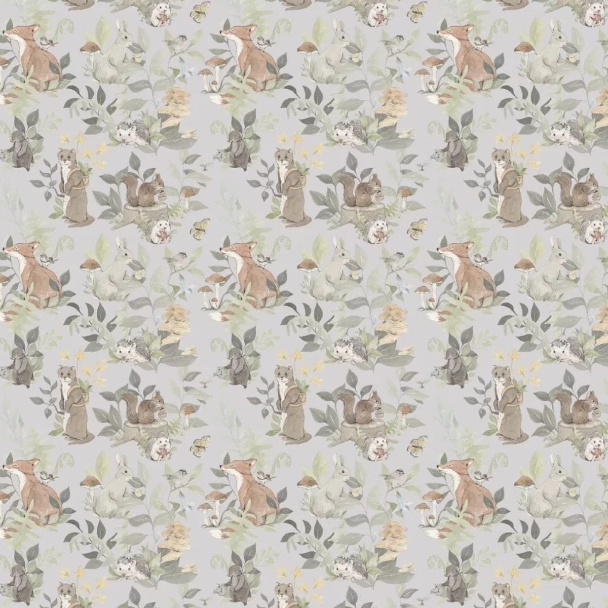 Tapeta dla dzieci Woodland to ulubione, leśne zwierzaki na delikatnym szarym tle. Dzięki neutralnej kolorystyce będzie idealna do pokoju chłopca i dziewczynki.