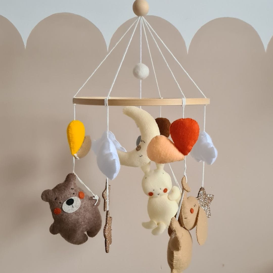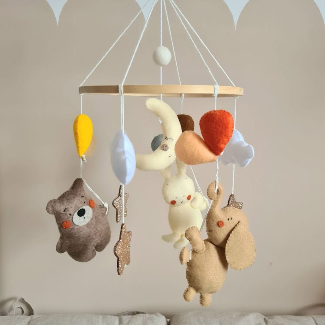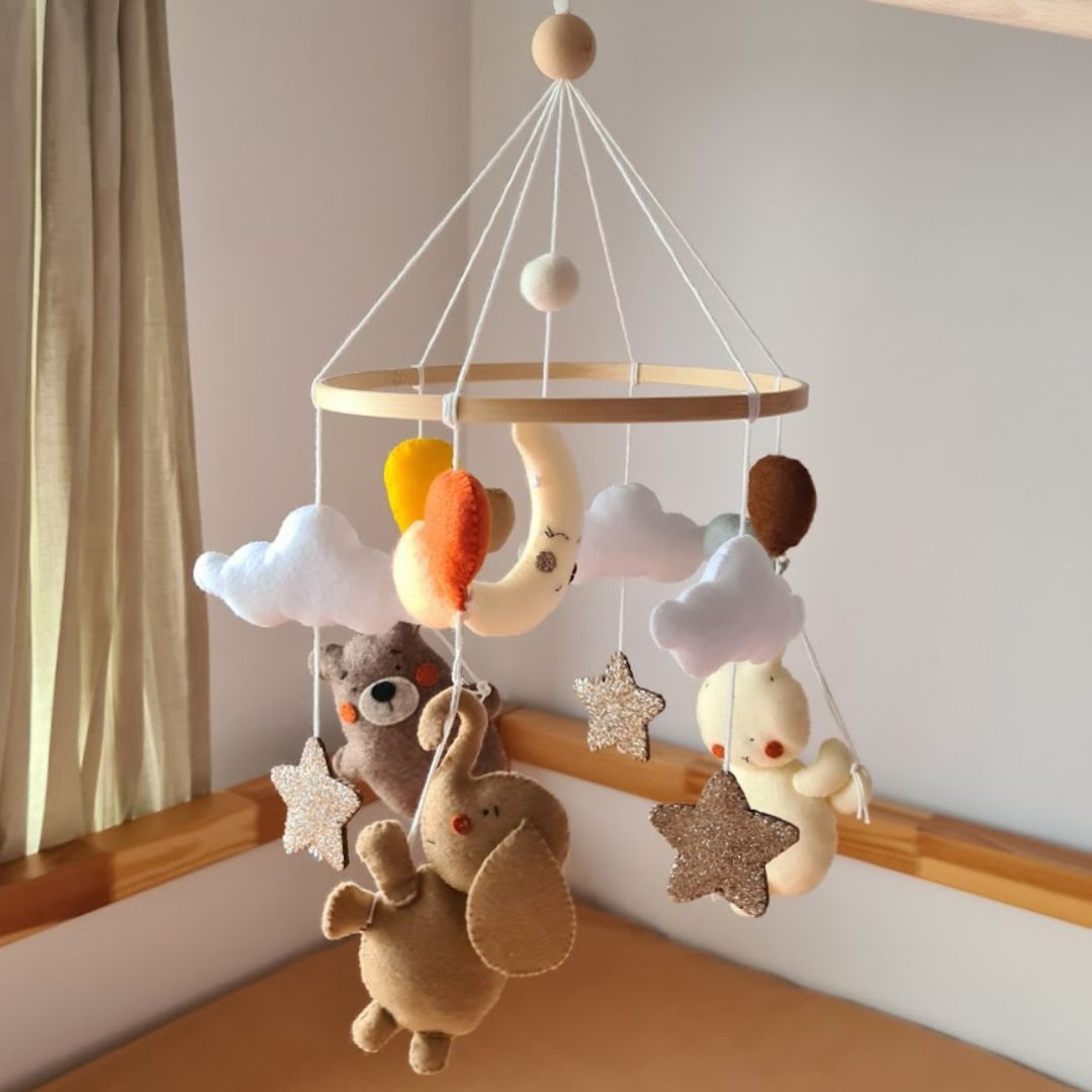 Karuzela Podróż Balonami to wyjątkowa dekoracja do łóżeczka Twojego dziecka, która wprowadzi maluszka w bajkowy świat pełen delikatnych barw i uroczych detali. W spokojnej tonacji beżu i brązu znajdziesz błyszczące gwiazdki, białe puszyste chmurki oraz wesołe zwierzątka – słoń, miś i zajączek – trzymające w łapkach kolorowe balony, które wirują wokół dużego księżyca w centrum karuzeli.