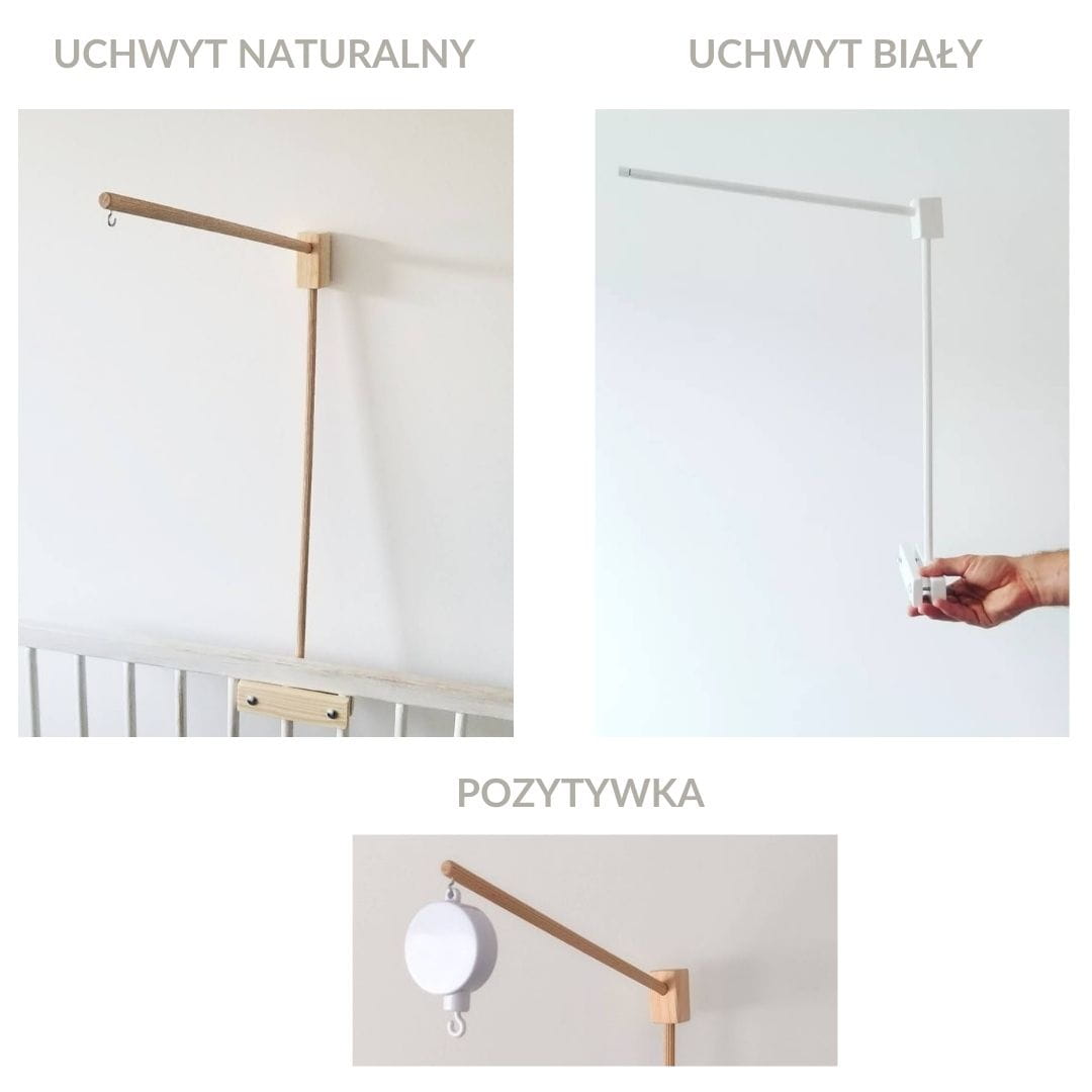 W zależności od potrzeb możesz wybrać uchwyt do karuzeli w kolorze białym lub naturalnym. Uchwyt posiada haczyk, na którym bez problemu zawiesisz karuzelkę.