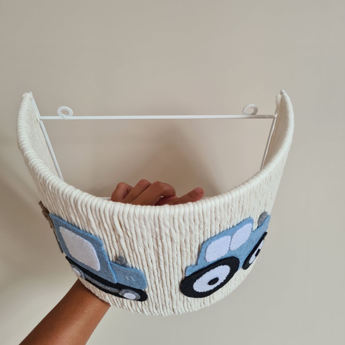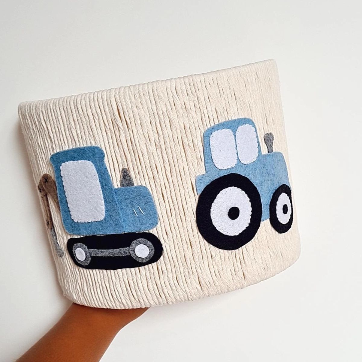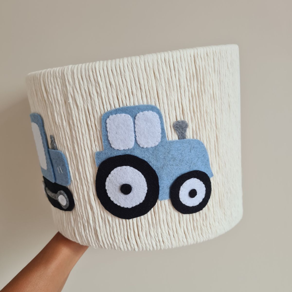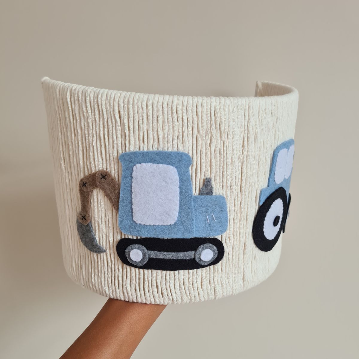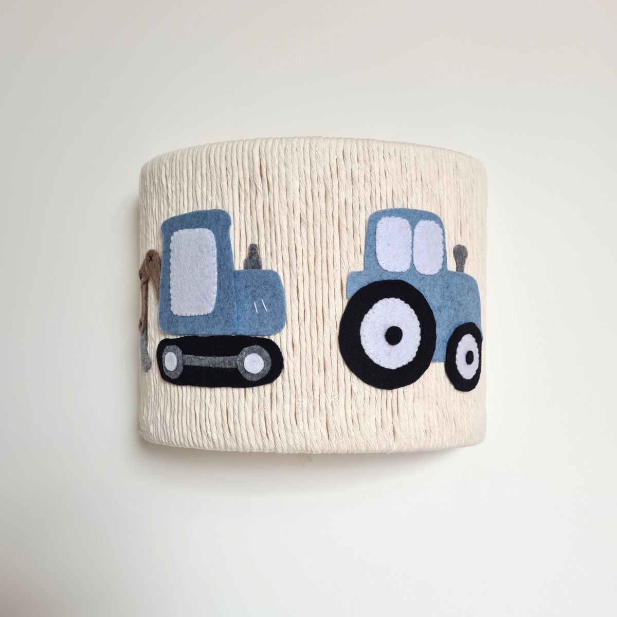 Klosz został wykonany z naturalnej bawełny i ozdobiony filcowymi aplikacjami przedstawiającymi koparkę i traktor. Dzięki starannemu ręcznemu wykonaniu i dbałości o każdy detal, stanowi nie tylko źródło światła, ale również wyjątkową ozdobę dziecięcego wnętrza.