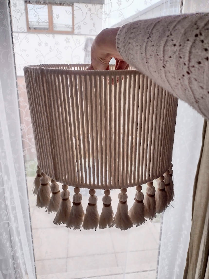 Każda lampa jest wyjątkowa, ponieważ została wykonana ręcznie z naturalnych materiałów. Klosz łączy w sobie subtelne piękno makramy oraz dekoracyjne frędzle oplecione jutowym sznurkiem, co nadaje całości oryginalny, a zarazem przytulny wygląd. Do produkcji wykorzystano wysokiej jakości sznurek bawełniany, jutę oraz włóczkę, dzięki czemu lampa jest nie tylko estetyczna, ale także trwała i przyjazna dla środowiska.