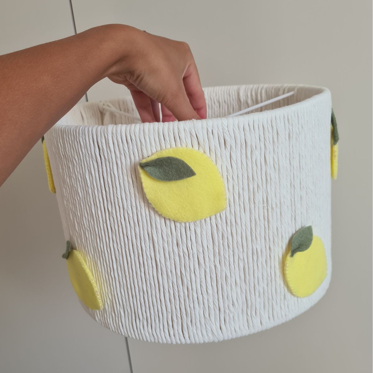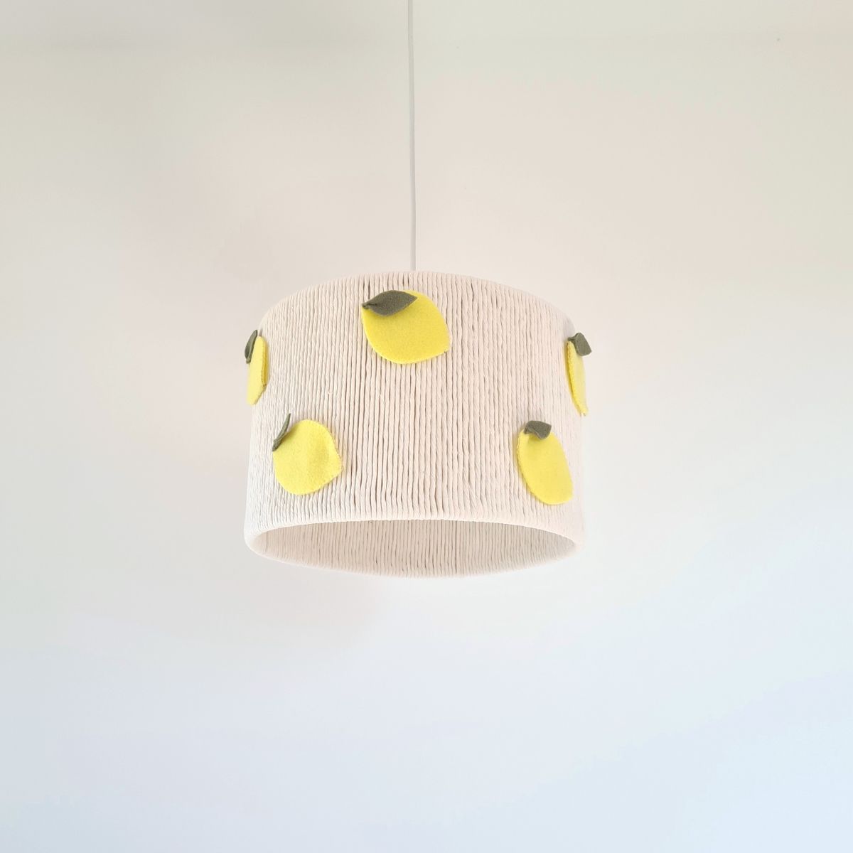 Dodaj energii i lekkości do aranżacji dzięki naszej ręcznie wykonanej lampie sufitowej z cytrynami. Abażur w soczystym żółtym kolorze, ozdobiony ośmioma cytrynkami z filcu i zielonymi listkami, wnosi do wnętrza radosny, wiosenny klimat. Idealna do pokoju dziecka, kuchni czy wnętrz inspirowanych naturą.