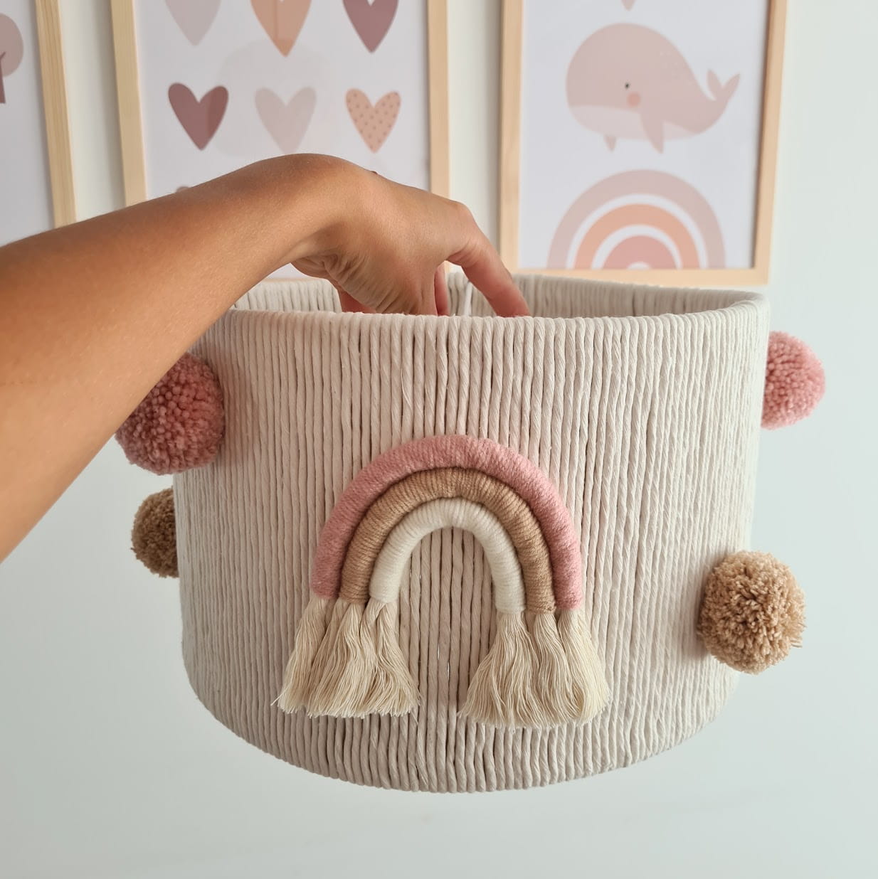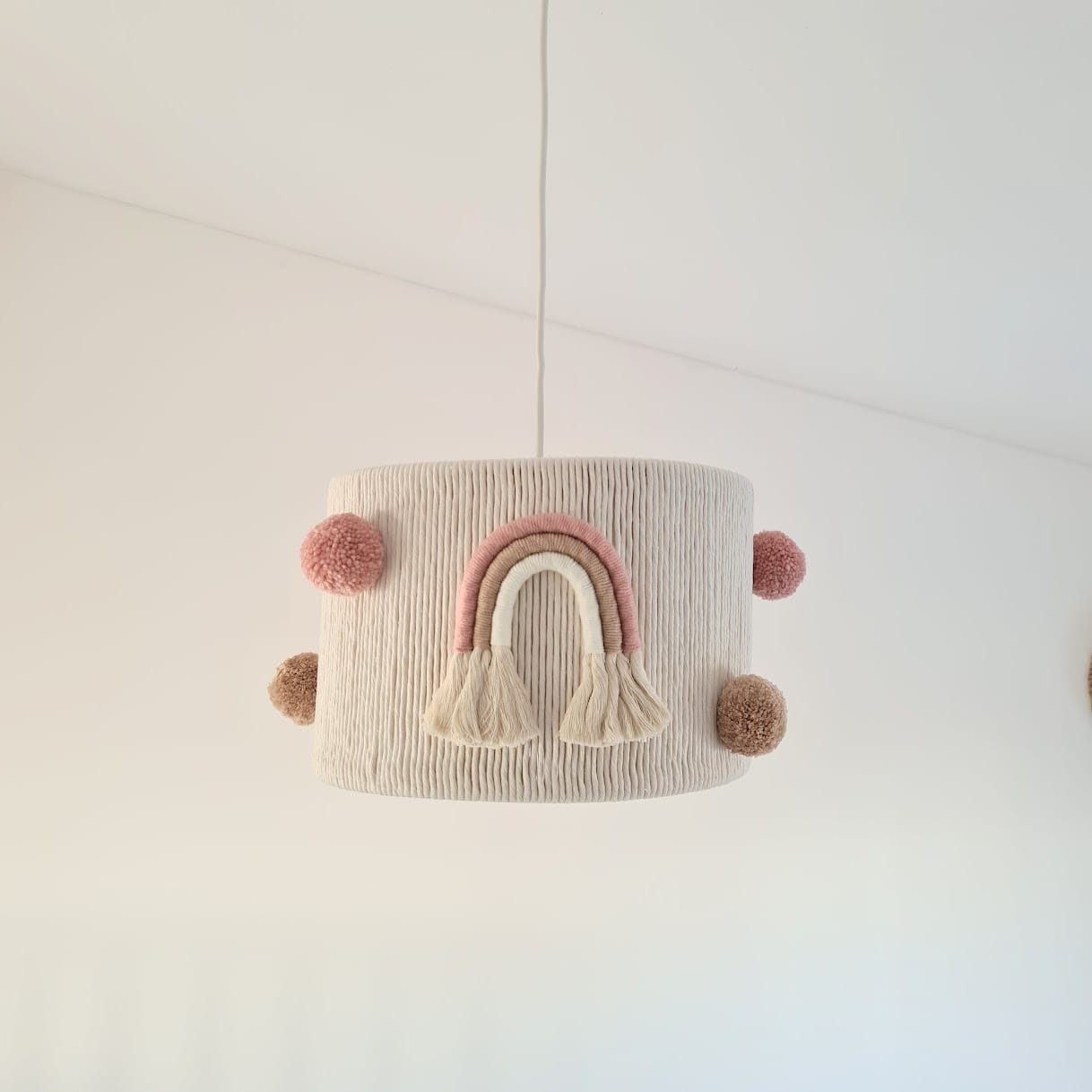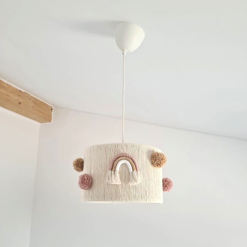 Klosz ozdobiony jest dwoma uroczymi tęczami, które dodają mu subtelnego uroku. Całość uzupełniają sześć miękkich, wełnianych pomponów w odcieniach brudnego różu i jasnego brązu, podkreślających jego unikalny styl.