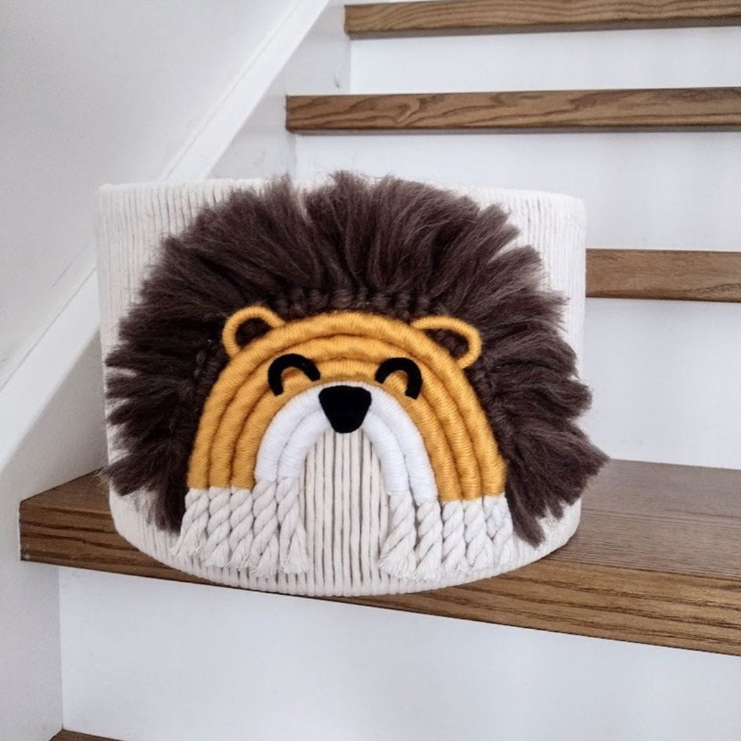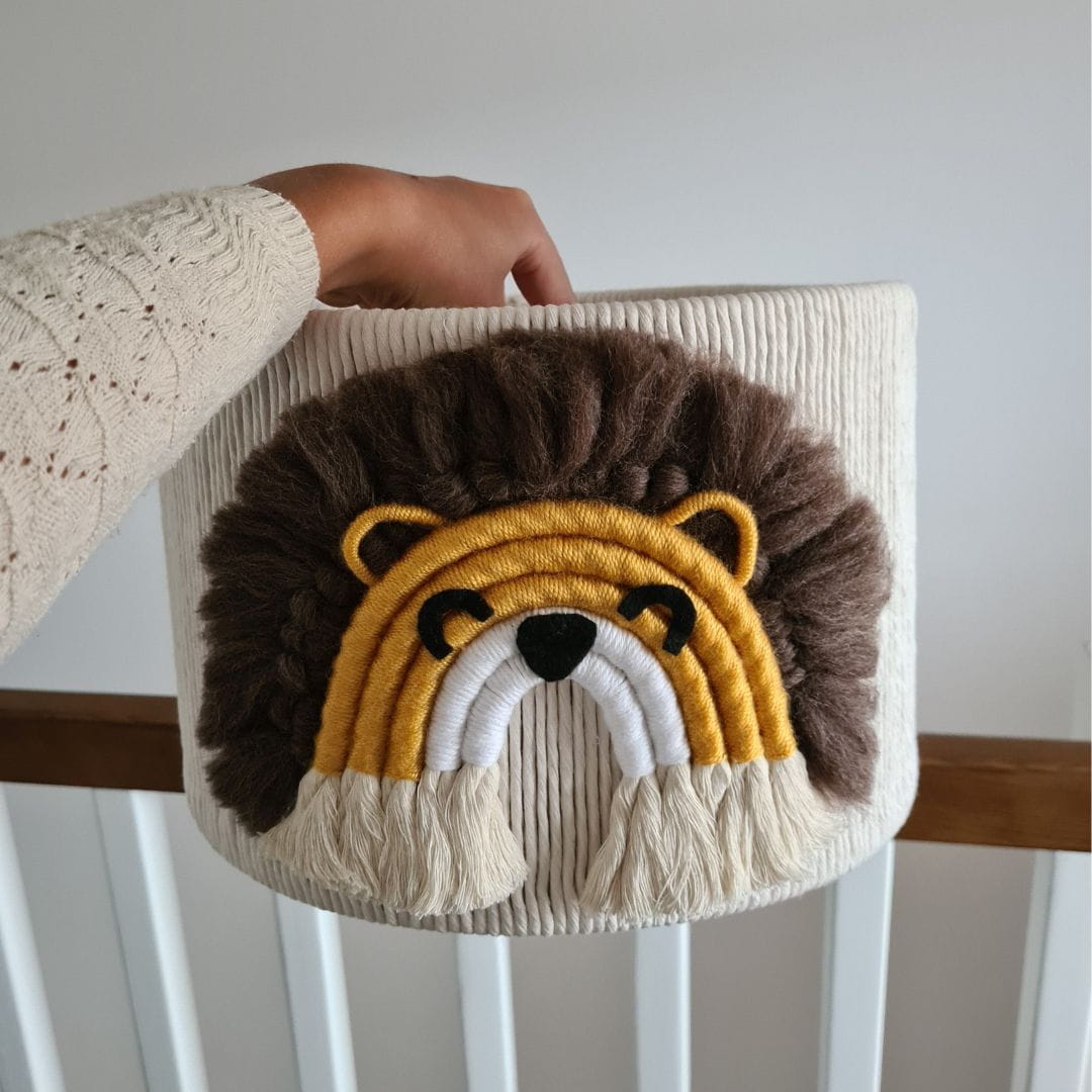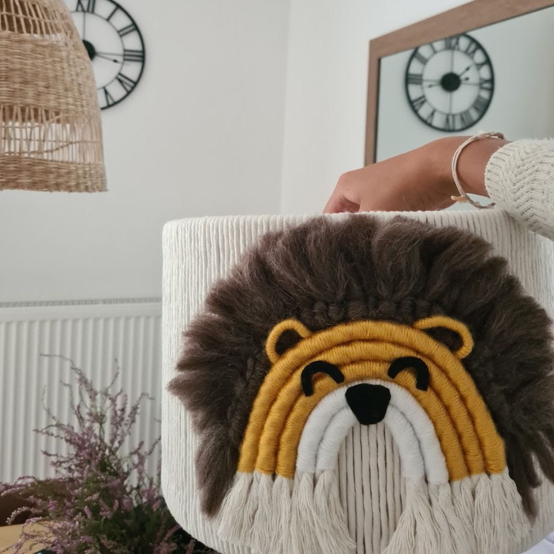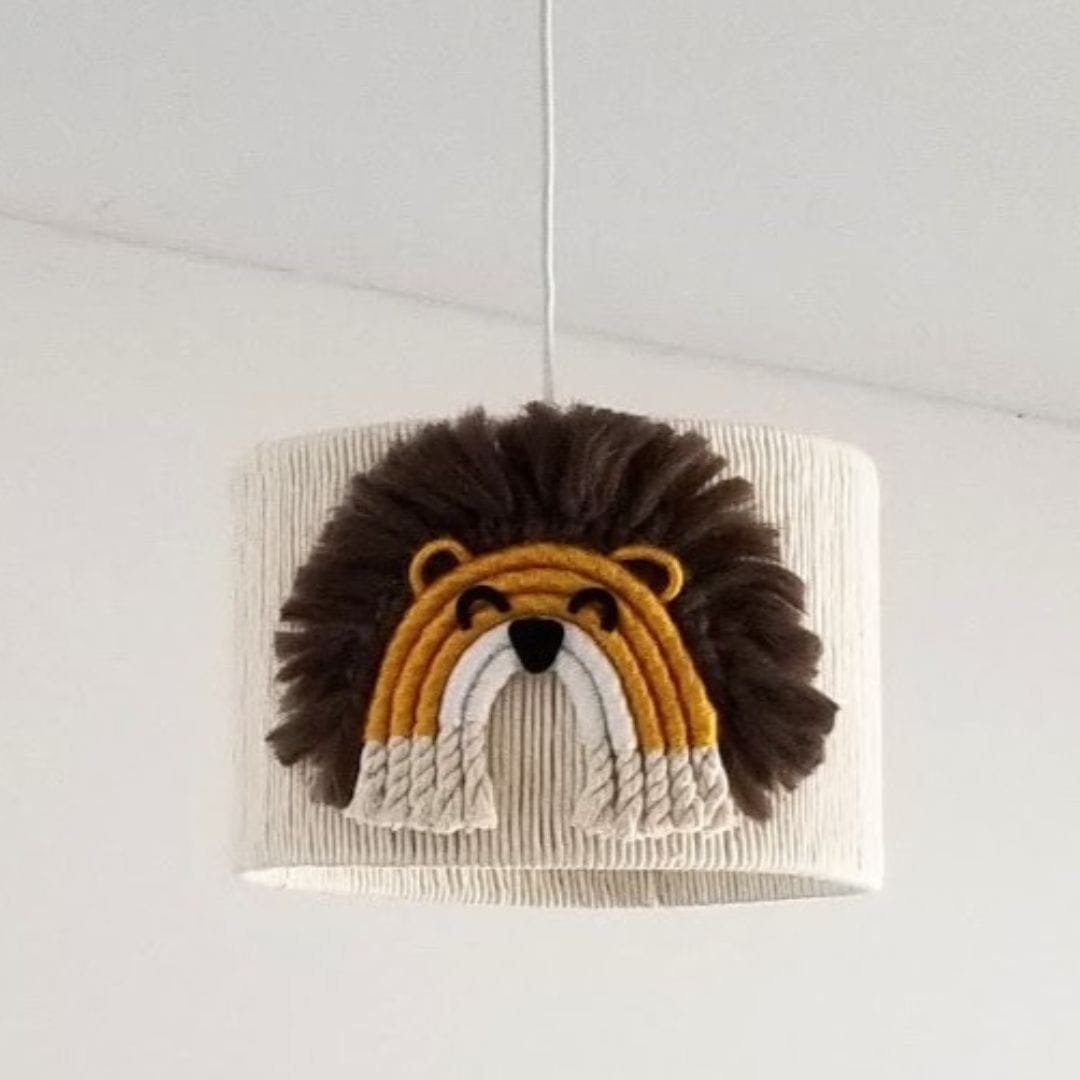 Klosz jest ręcznie tkany i szyty z najwyższej jakości bawełnianego sznurka oraz miękkiej włóczki, co nadaje mu wyrazistego charakteru i gwarantuje trwałość. Ozdobiony uroczymi aplikacjami przedstawiającymi przyjazne lwy w subtelnym, jednolitym wzorze, idealnie wpisuje się w dziecięcy styl i tematykę safari.