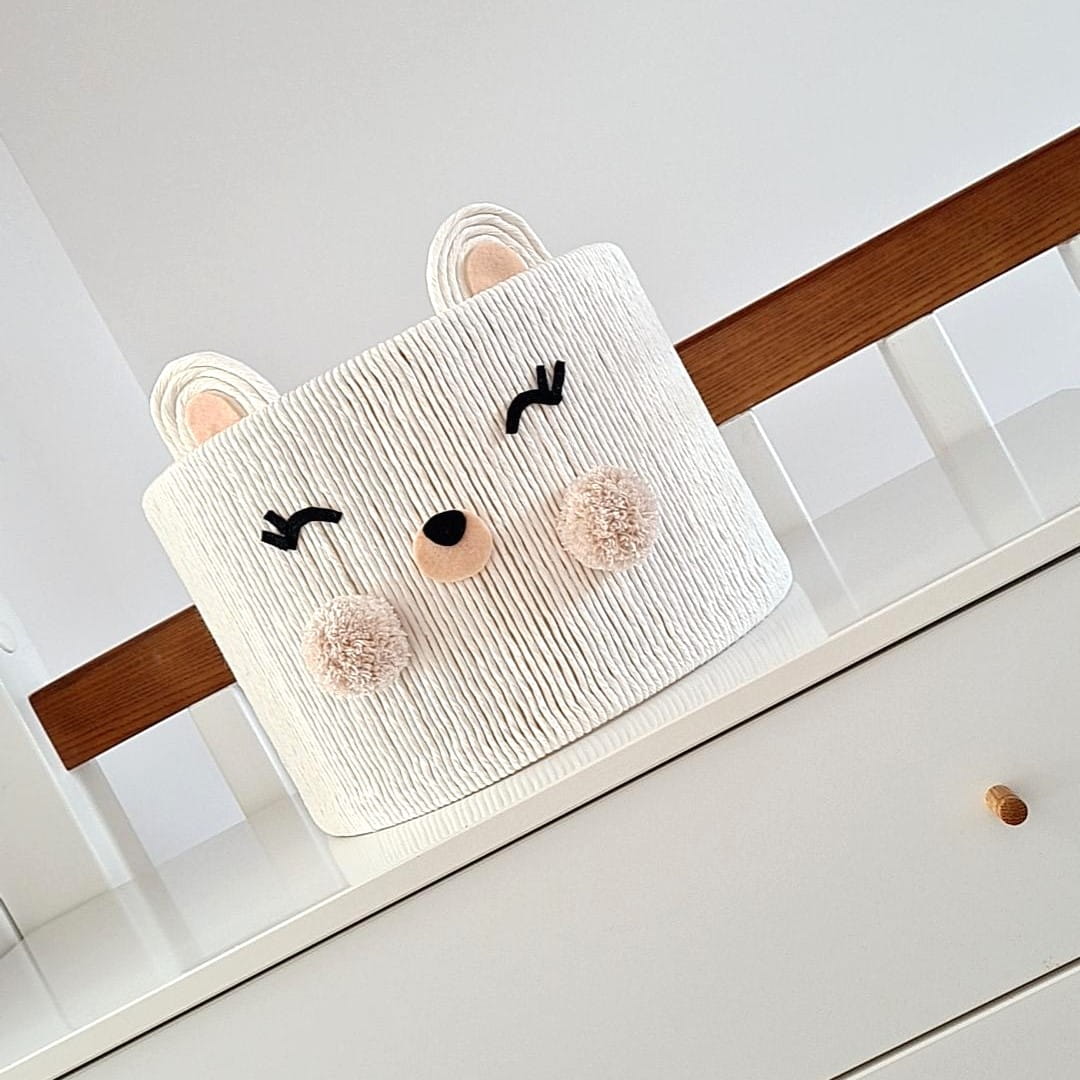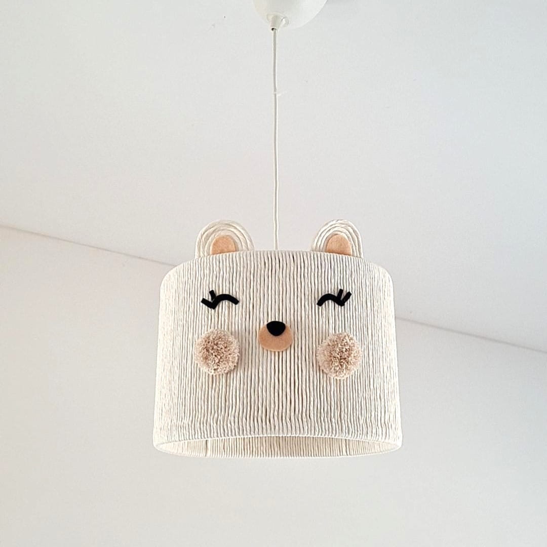 Abażur ozdobiony jest buźkami dwóch sympatycznych misiów, umieszczonymi po obu stronach, oraz czterema puszystymi pomponami, które imitują ich urocze policzki. Całość została wykonana ręcznie z naturalnych materiałów, takich jak sznurek bawełniany, włóczka i wełna, co gwarantuje unikalność i trwałość każdego egzemplarza.