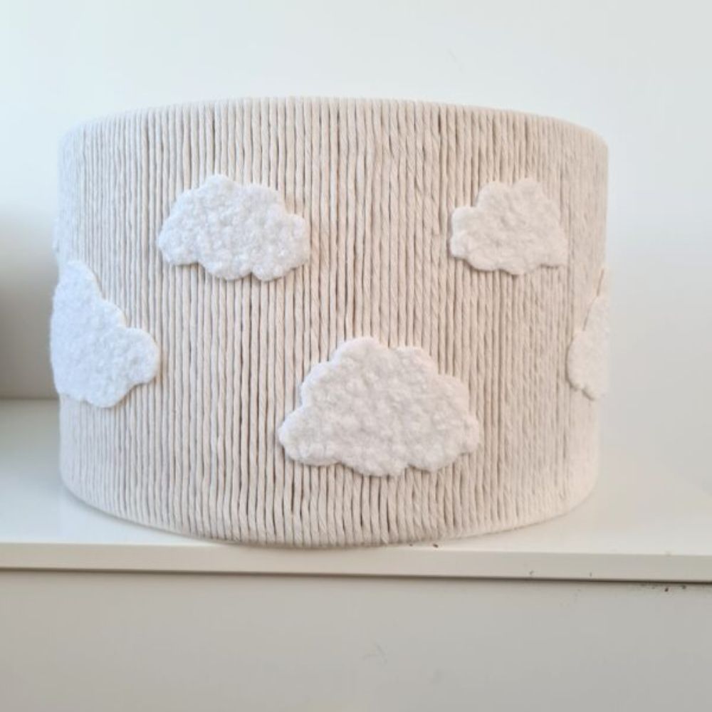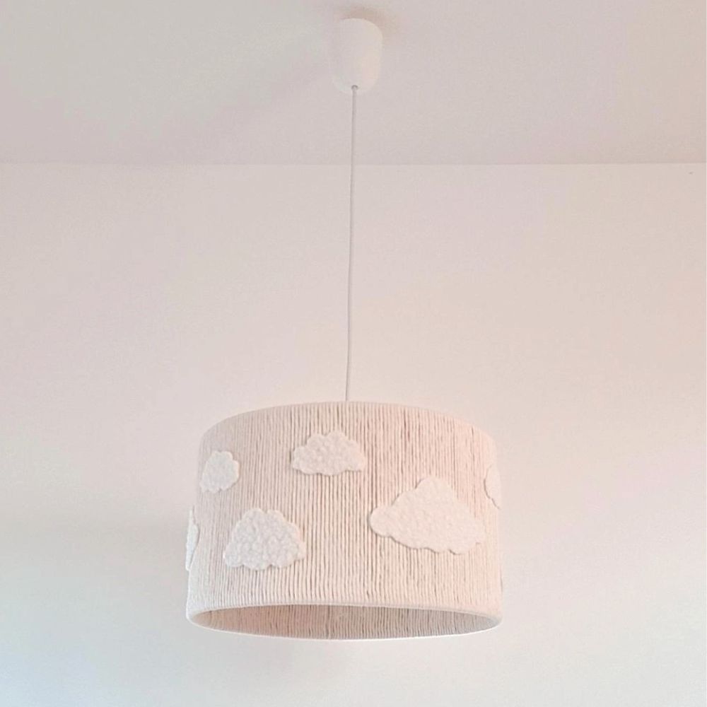 Szukasz oświetlenia, które odmieni wnętrze i wprowadzi do niego kojący nastrój? Lampa wisząca Puszyste Chmurki to połączenie finezyjnego rzemiosła z nowoczesnym designem. Kremowy abażur w kształcie walca, wykonany z gęsto plecionego sznurka bawełnianego, stanowi idealną bazę dla wypukłych aplikacji 3D. Miękkie chmurki z tkaniny typu baranek (boucle) sprawiają, że lampa wygląda jak wyjęta prosto z najpiękniejszych dziecięcych snów.