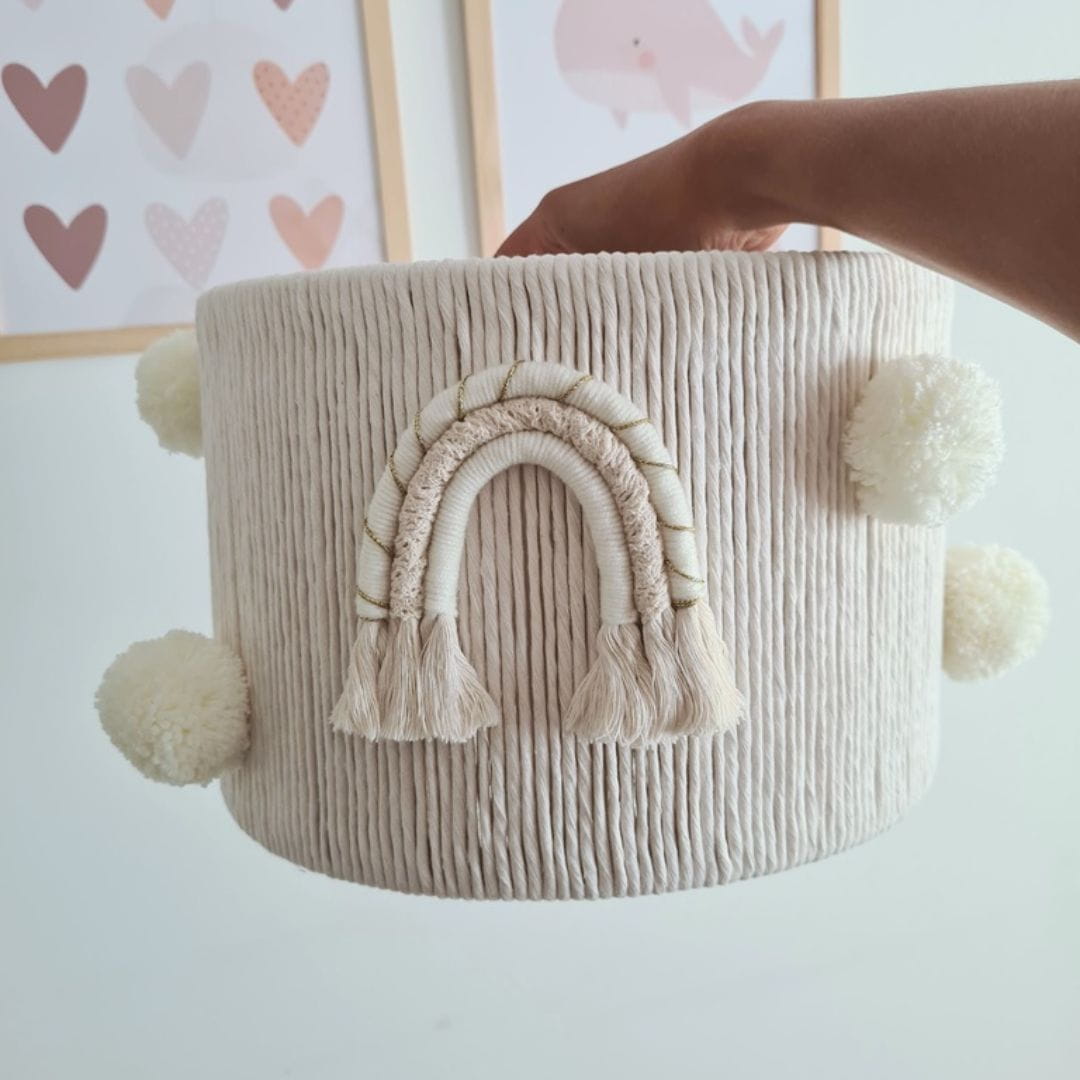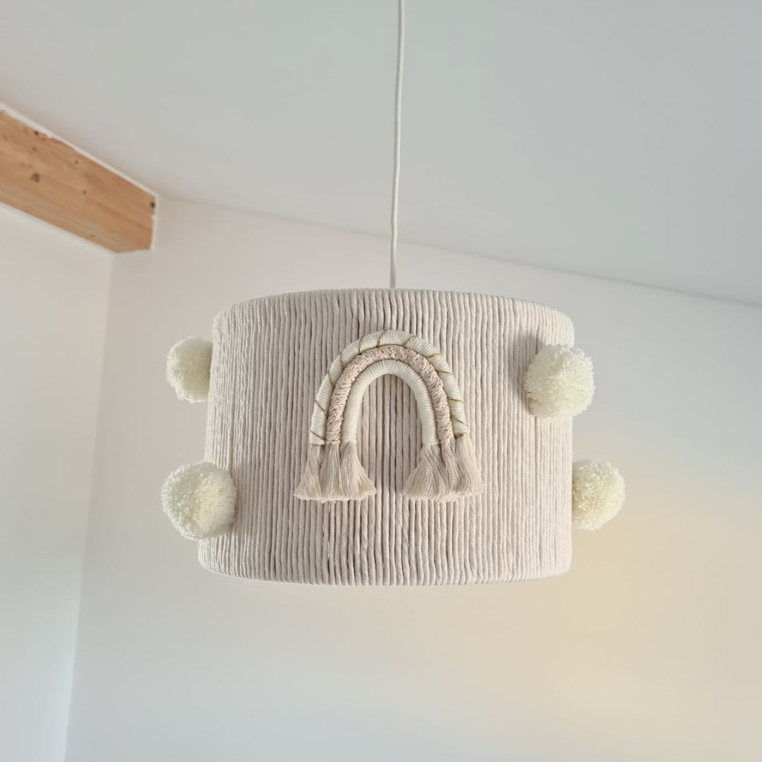 Klosz ozdobiony jest dwoma filcowymi tęczami w tym samym wzorze, które wprowadzają ciepło i przytulność, oraz sześcioma miękkimi, wełnianymi pomponami, które dodają mu lekkości i uroku. Ręczne wykonanie z wykorzystaniem bawełnianego sznurka i włóczki gwarantuje nie tylko estetykę, ale także trwałość i unikalny charakter produktu.