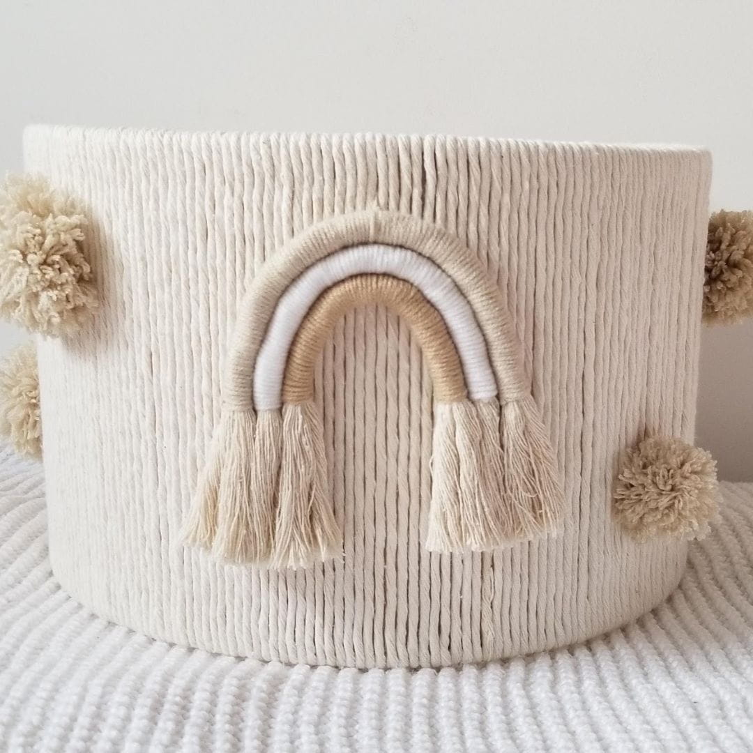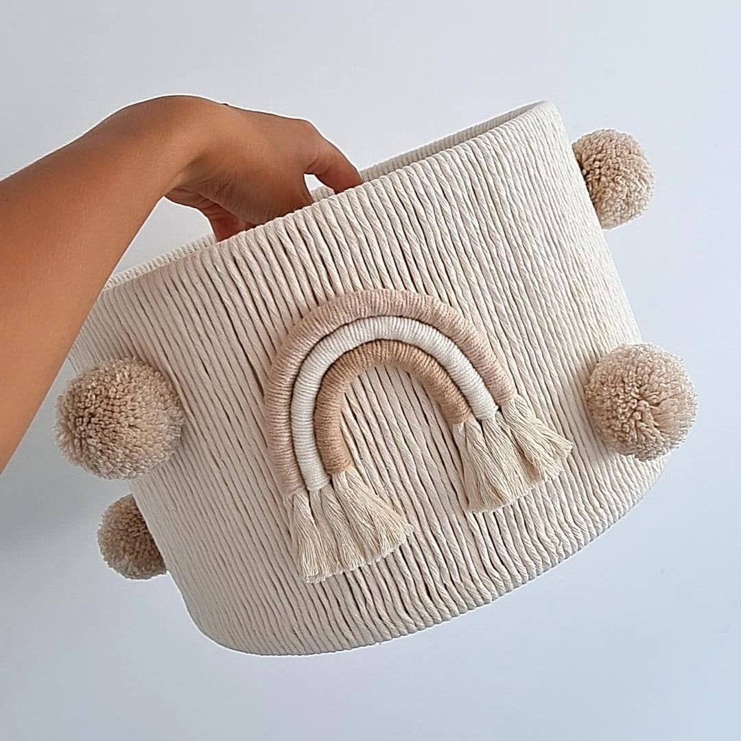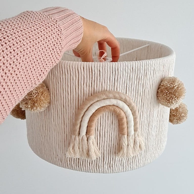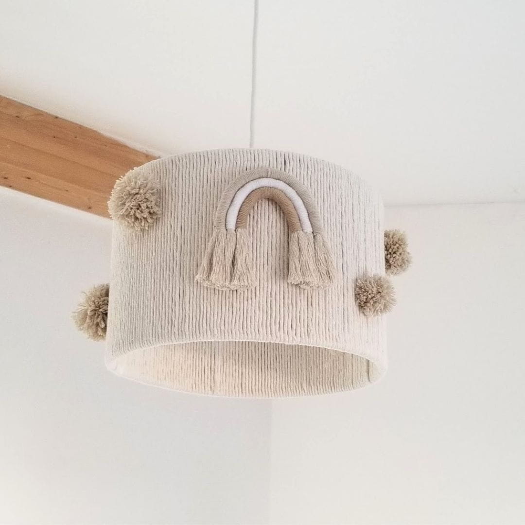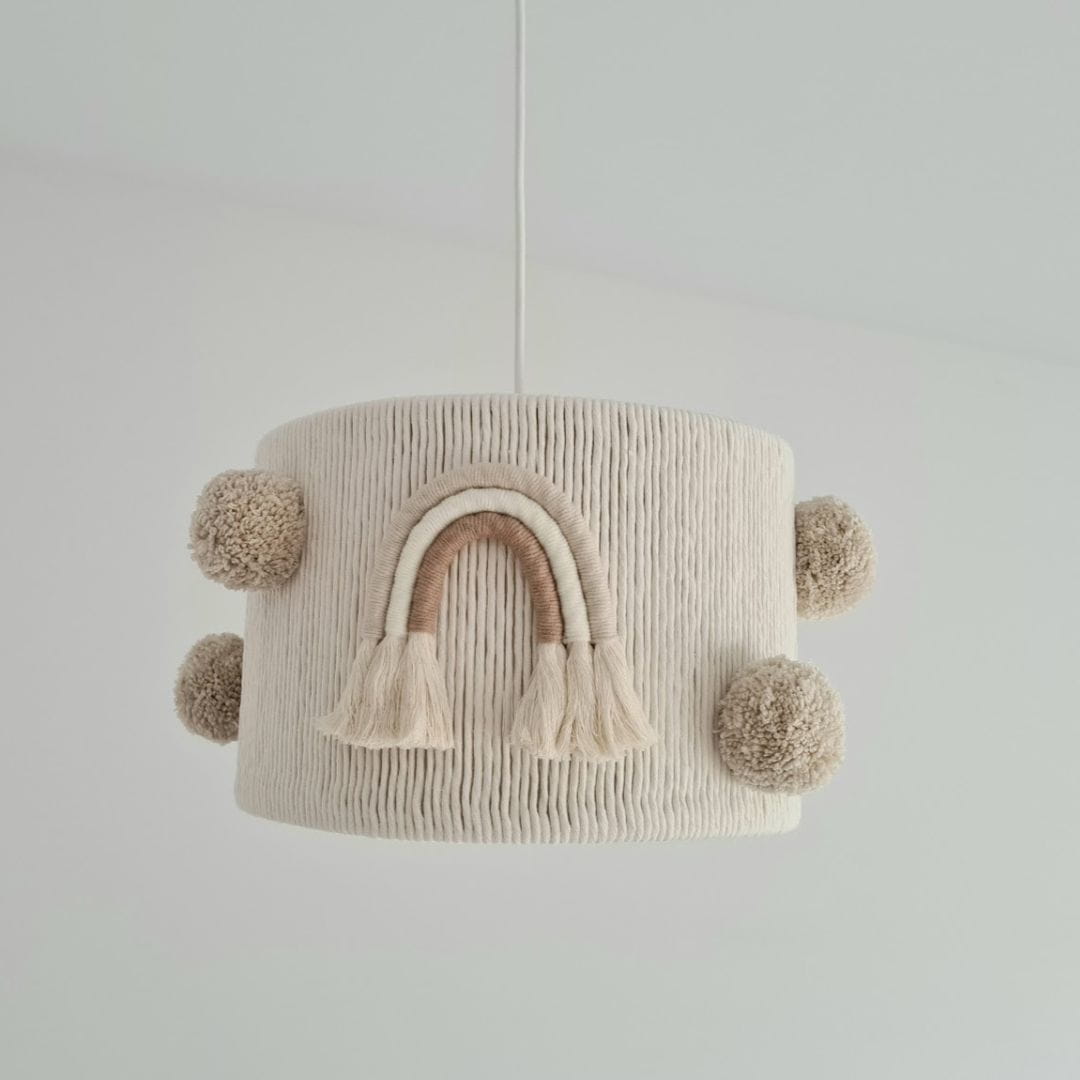 Wprowadź ciepło i przytulność do pokoju swojego dziecka z wyjątkową lampą sufitową w delikatnych odcieniach beżu i ecru. Ozdobny klosz wyróżnia się subtelnym designem, który harmonijnie wpasuje się w różnorodne aranżacje wnętrz. Uroku dodają dwie urocze tęcze wykonane w tym samym wzorze oraz sześć puszystych, wełnianych pomponów, które tworzą efektowny i niepowtarzalny akcent.