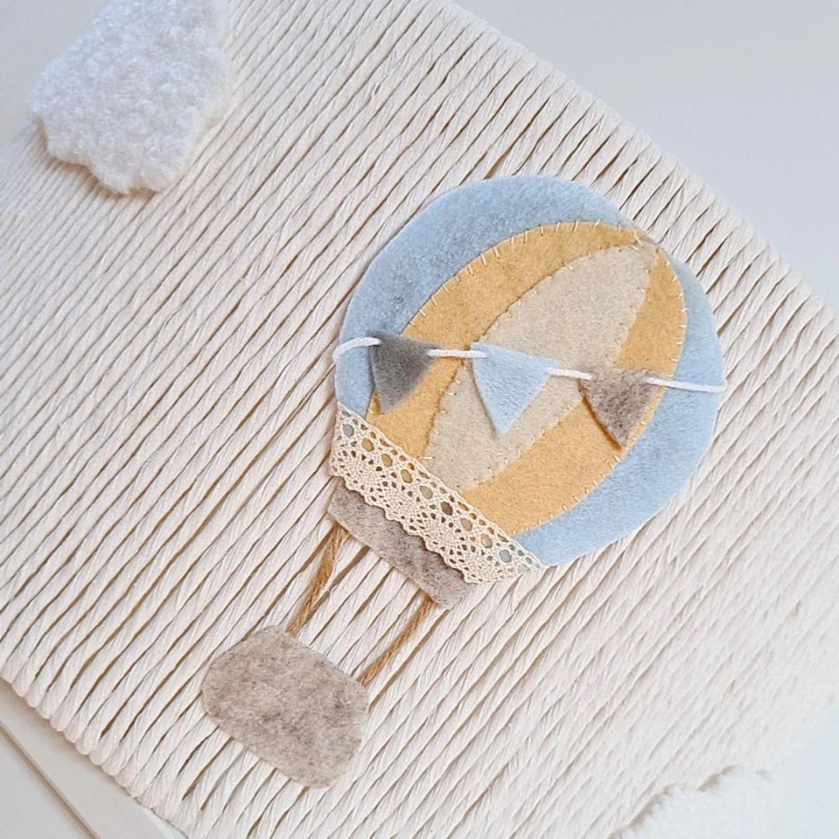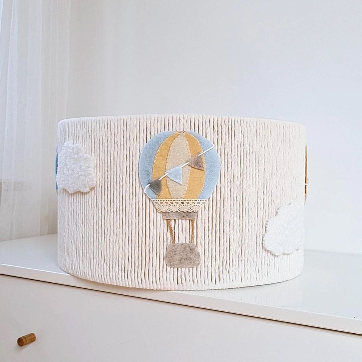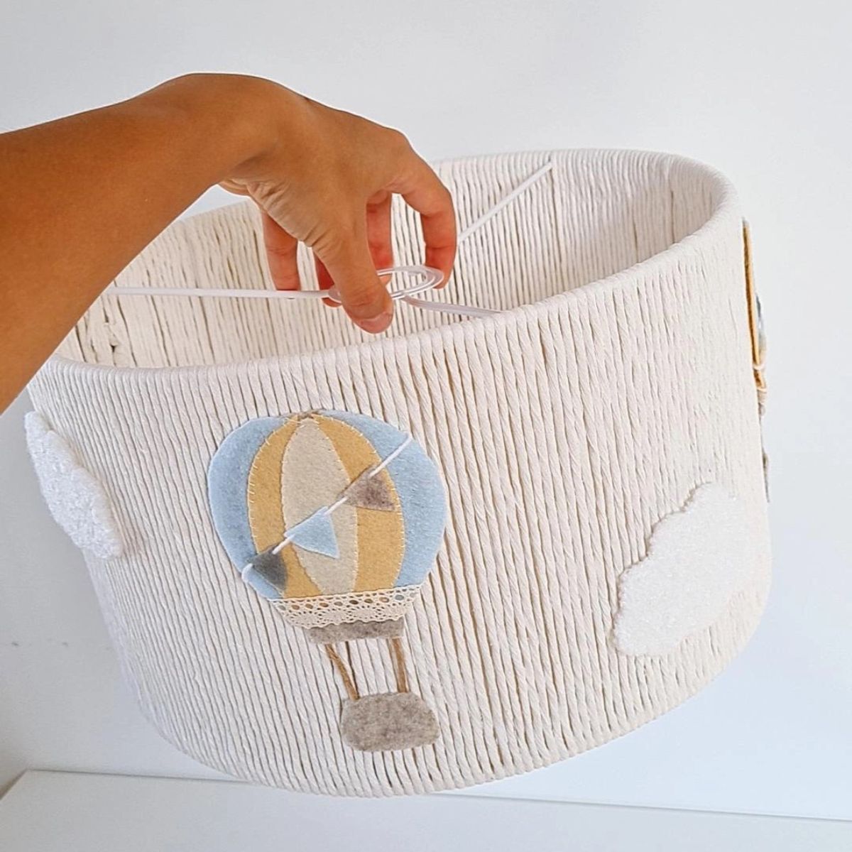 Każda sztuka wykonana jest ręcznie z dbałością o detale, co czyni ją niepowtarzalną. Motyw unoszących się balonów i puszystych chmurek rozbudza dziecięcą wyobraźnię, a jednocześnie stanowi delikatną ozdobę, która wpisuje się w aranżacje oparte na naturalnych materiałach i spokojnej kolorystyce.