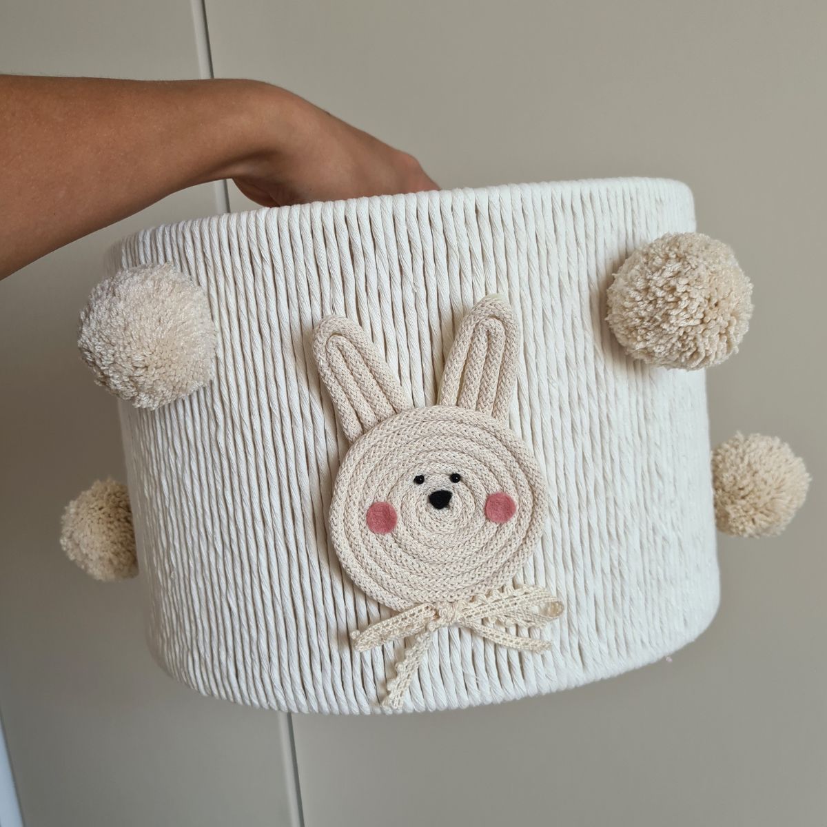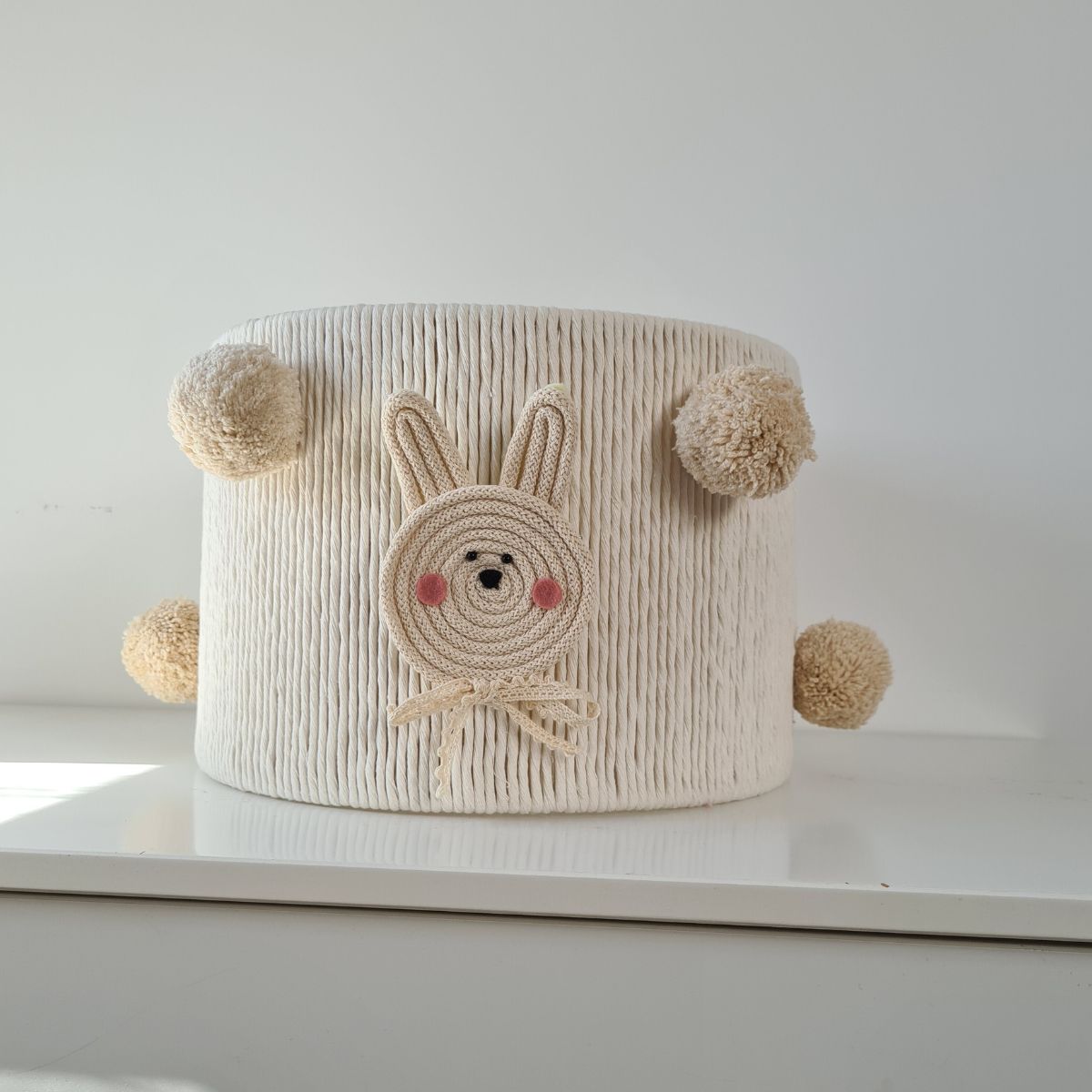 Delikatna kolorystyka – połączenie bieli i kremu z jasnobeżowymi pomponami oraz subtelnymi zawieszkami w kształcie zajączków wprowadza do pokoju dziecięcego spokój i lekkość.