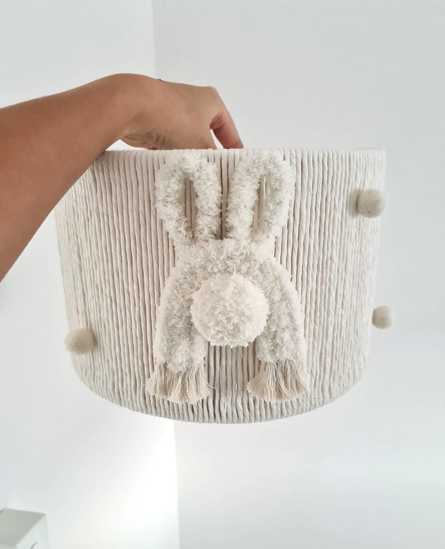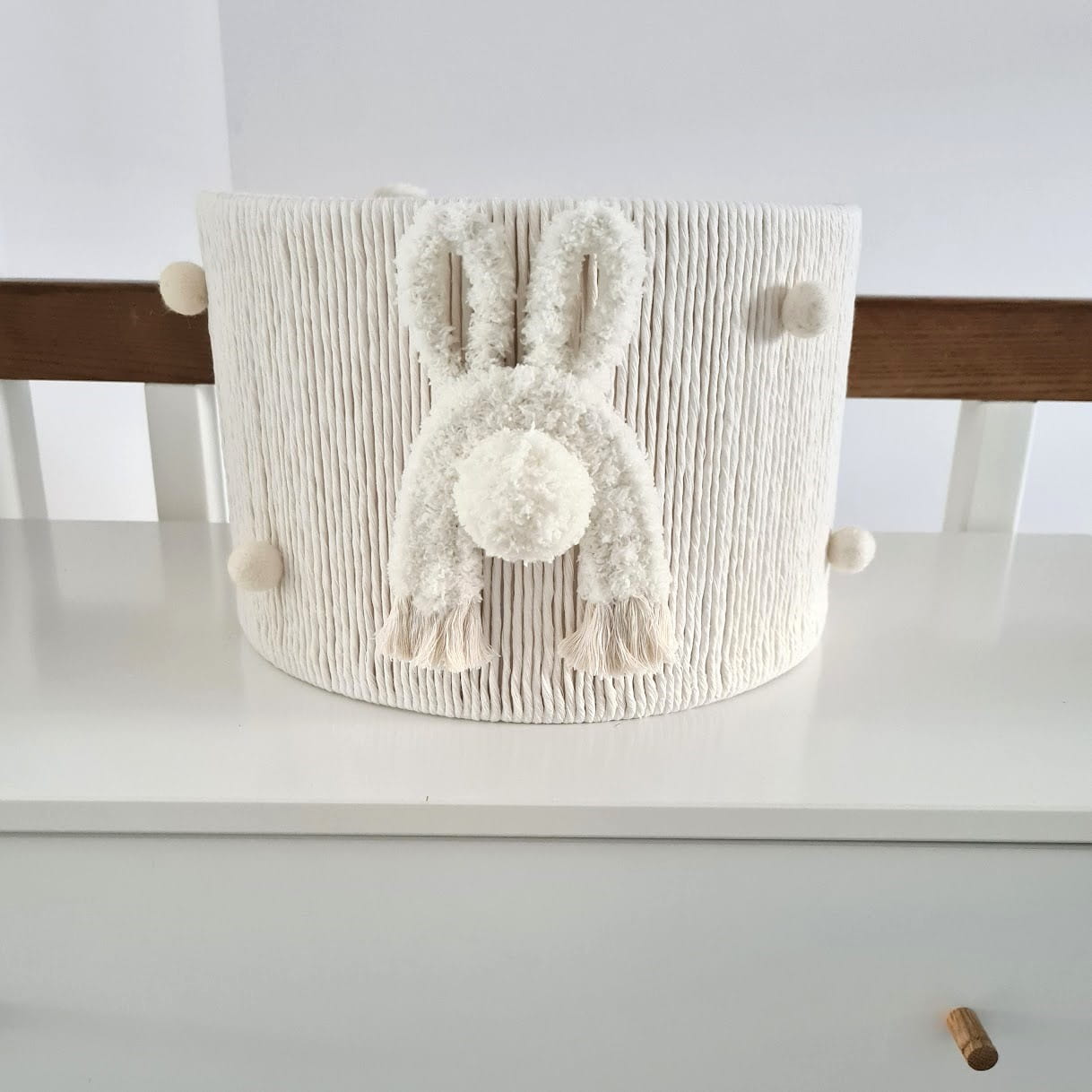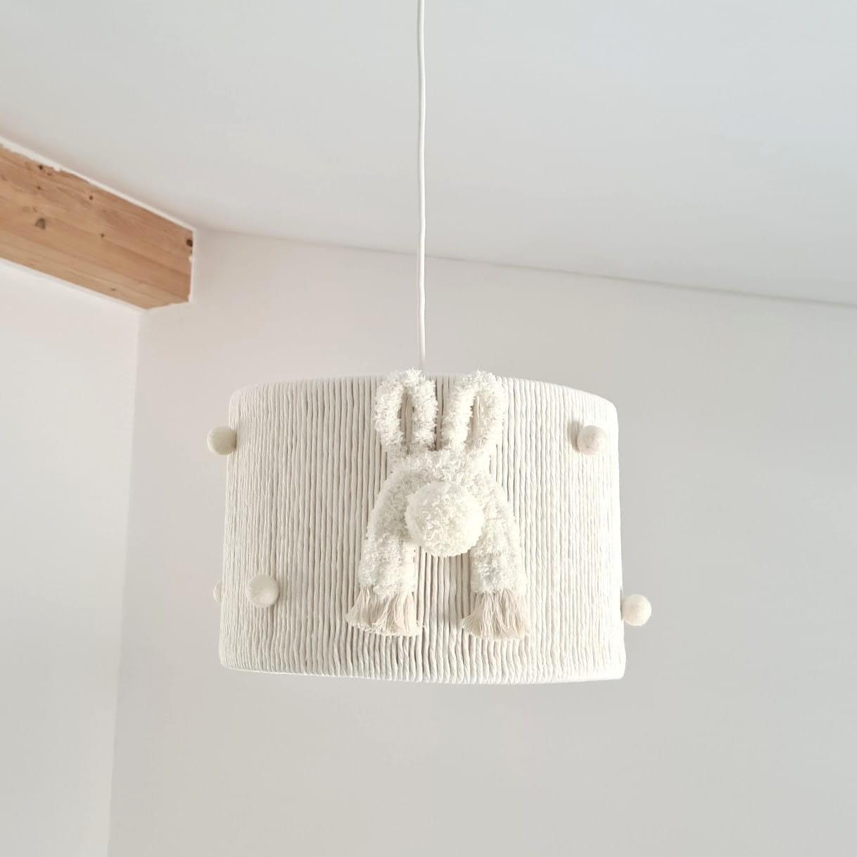 Lampa wyróżnia się ręcznie wykonanym abażurem, który jest tkany i szyty z naturalnych materiałów, takich jak bawełniany sznurek i miękka włóczka. To nie tylko gwarancja wysokiej jakości, ale również unikalności – każdy egzemplarz posiada swój niepowtarzalny charakter. Ozdoby w postaci dwóch puchatych zająców oraz ośmiu wełnianych kuleczek nadają lampie uroku i przytulności, tworząc atmosferę sprzyjającą relaksowi i zabawie.