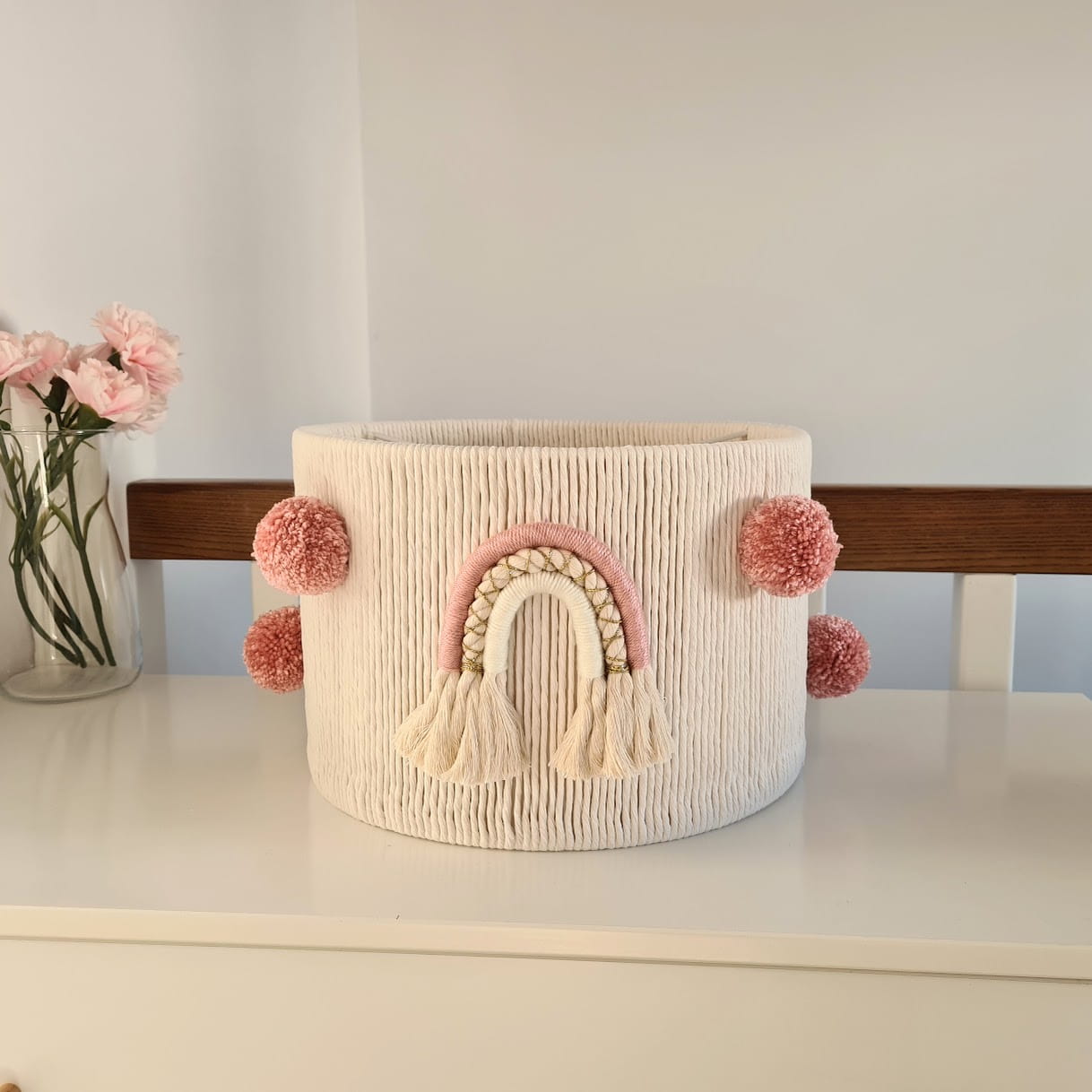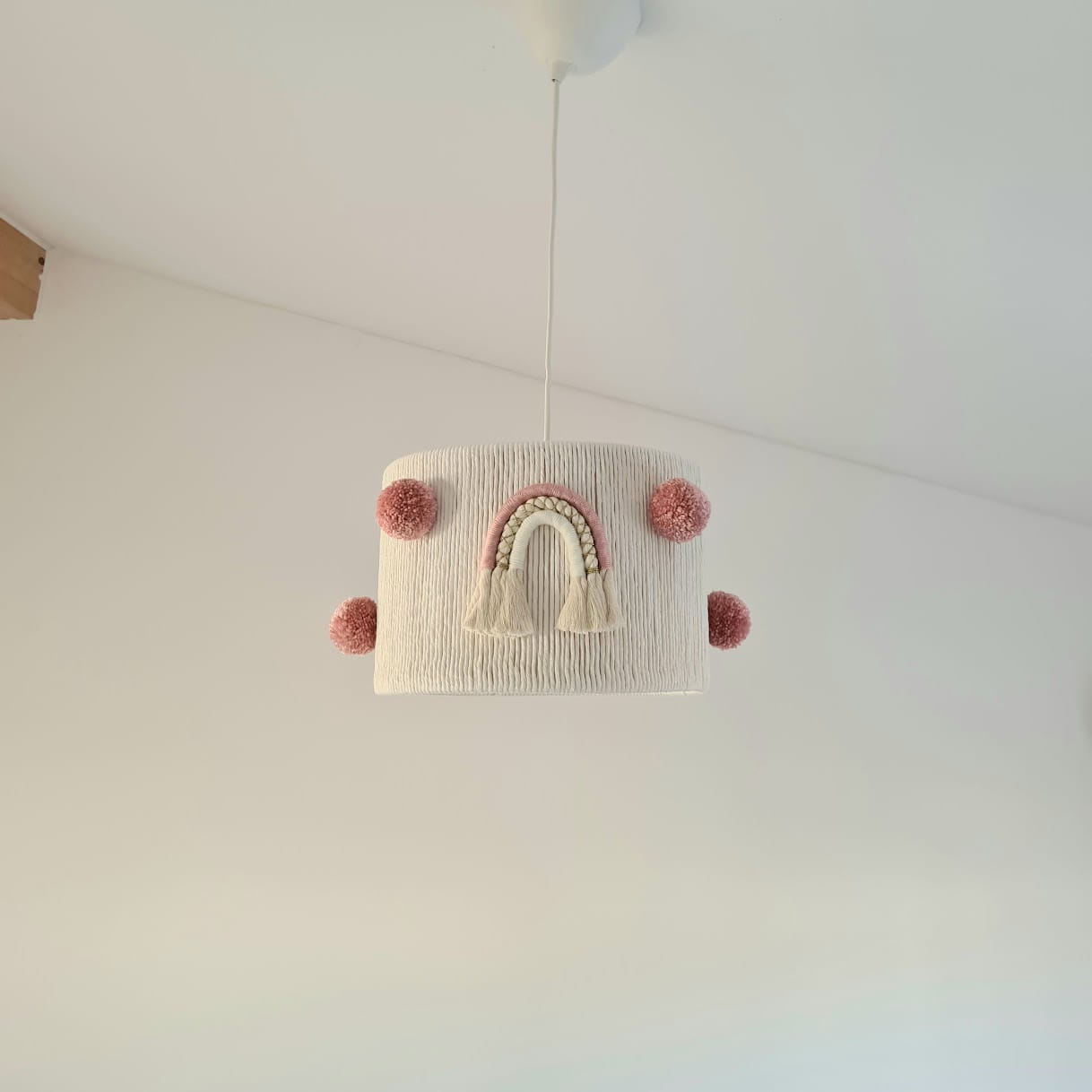 Klosz został ozdobiony dwoma tęczami w tym samym wzorze, co nadaje mu bajkowego charakteru. Uzupełnieniem są miękkie, wełniane pompony w ilości sześciu sztuk, które dodają lekkości i uroku. Naturalna kolorystyka sprawia, że lampa doskonale wpisuje się w styl boho, skandynawski czy klasyczny, tworząc przytulną atmosferę w dziecięcym pokoju.