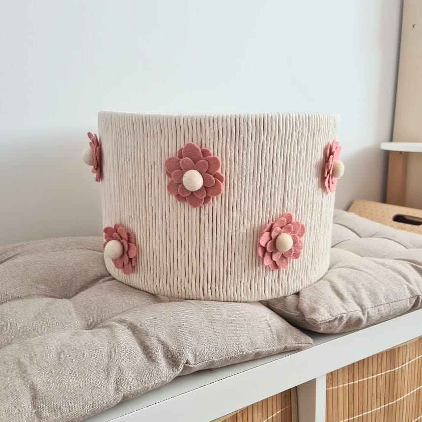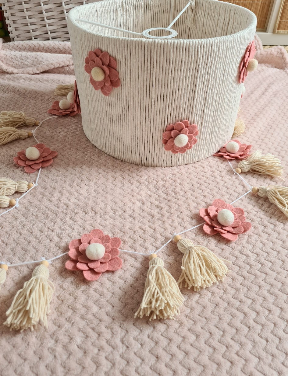 Ozdobą lampy są misternie wykonane kwiaty typu margaretki, stworzone z wysokiej jakości filcu w kolorze brudnego różu. Te kwiatowe detale dodają lampie romantycznego, dziewczęcego uroku i sprawiają, że staje się ona centralnym punktem dekoracyjnym każdego pokoju. Kompozycję uzupełniają kremowe wełniane kulki wykonane z polskiej wełny czesankowej, które nadają całości lekkości i harmonii.