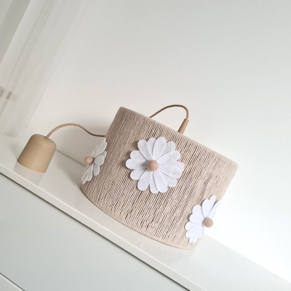 - naturalne materiały – ozdobne kulki wykonane z prawdziwej wełny oraz ręcznie wycinane kwiatki z filcu nadają lampie przyjazny wygląd