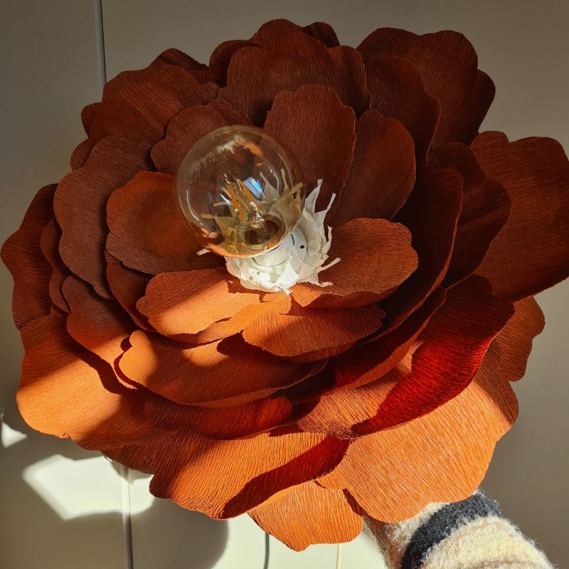 Sekret wyjątkowości tej lampy tkwi w wysokiej jakości włoskiej krepinie. To właśnie ten materiał nadaje płatkom unikatową teksturę i głębię, której nie znajdziesz w masowej produkcji. Każdy klosz jest formowany ręcznie, co sprawia, że nie ma dwóch identycznych egzemplarzy. Kupując tę lampę, wybierasz polskie rękodzieło, które łączy artystyczną duszę z precyzją wykonania najwyższej próby.