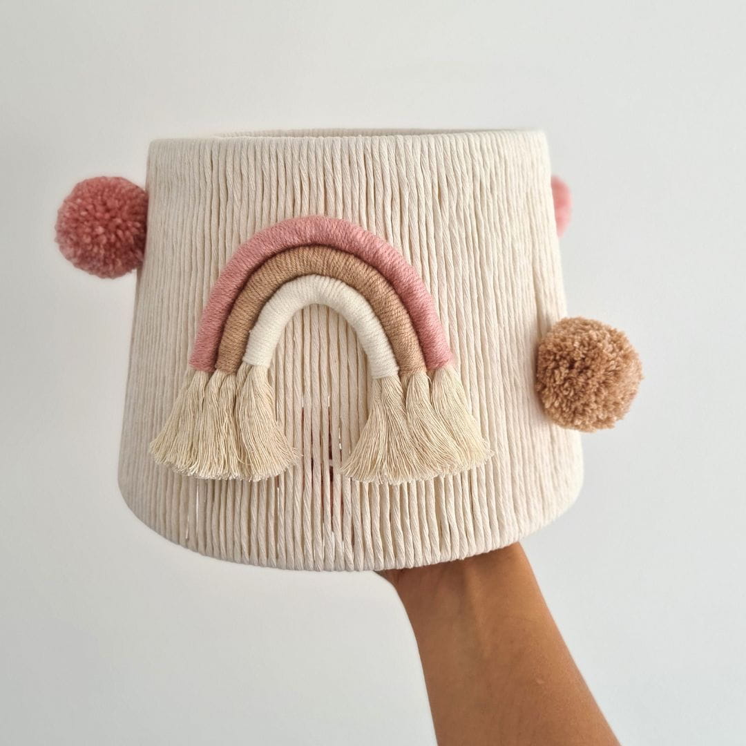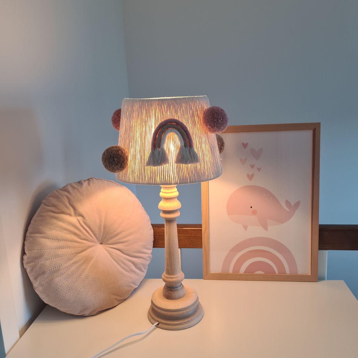 Dekoracyjny klosz zdobią dwie ręcznie wykonane tęcze oraz cztery puszyste pompony w subtelnych odcieniach beżu i różu. Taka harmonijna kolorystyka sprawia, że lampka doskonale wpisuje się w dziewczęce aranżacje wnętrz, dodając im ciepła i delikatności.
