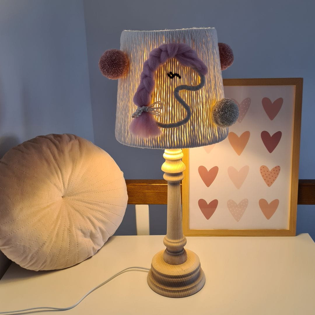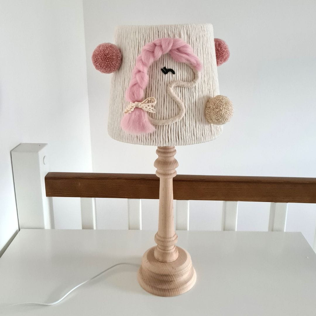 Lampka nocna Koniki to wyjątkowy element wystroju, który wniesie ciepło i urok do pokoju każdej dziewczynki. Abażur został ręcznie ozdobiony delikatnymi detalami, które tworzą spójną, dziewczęcą kompozycję. Dwa urocze koniki w odcieniach ciepłego beżu, z różowymi grzywami, nadają lampce niepowtarzalny charakter. Po obu stronach koników znajdują się puszyste pompony, harmonijnie dopasowane do kolorystyki. Całość dopełnia klosz wykonany z naturalnych materiałów – sznurka bawełnianego i miękkiej włóczki, co podkreśla przytulność lampki.