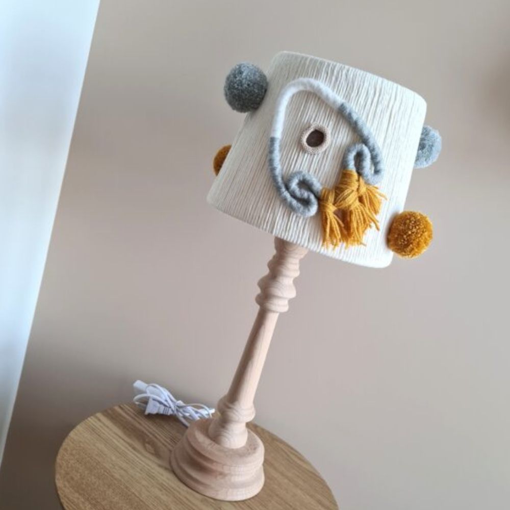 Lampka nocna z rakietą to niezwykła dekoracja, która zachwyci każdego małego miłośnika przestrzeni kosmicznej. Abażur został ozdobiony dwoma dużymi rakietami, które umieszczono po obu stronach klosza, oraz czterema puszystymi pomponami w odcieniach szarości i pomarańczu, idealnie podkreślającymi kosmiczny motyw.