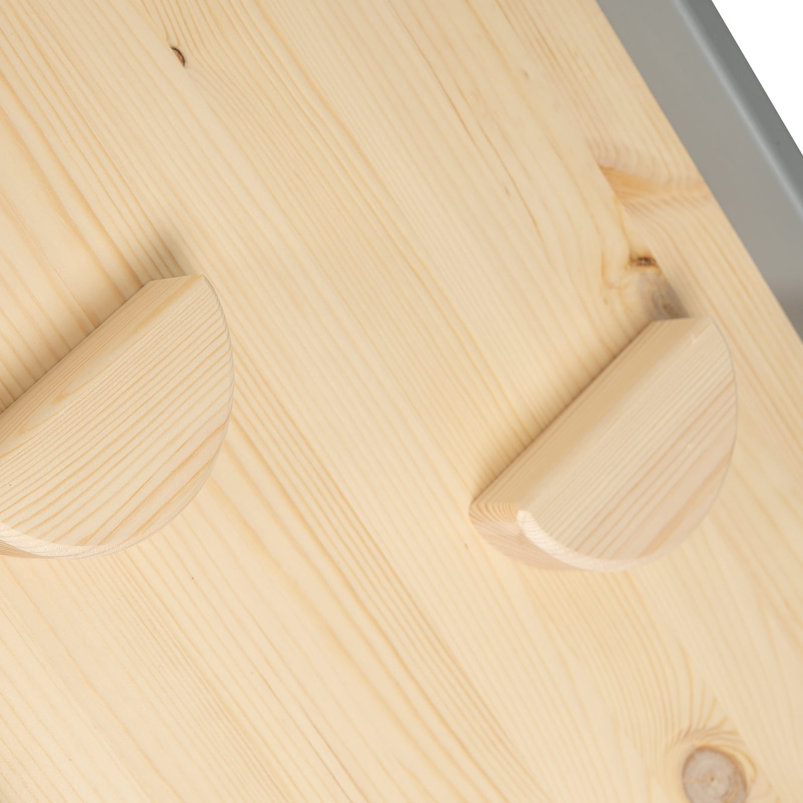 Drabinka do pokoju dziecka ma gładkie, zaokrąglone krawędzie. Wykonana jest z naturalnego drewna sosnowego pomalowanego lakierem wodnym (drążki zabezpieczone olejem).