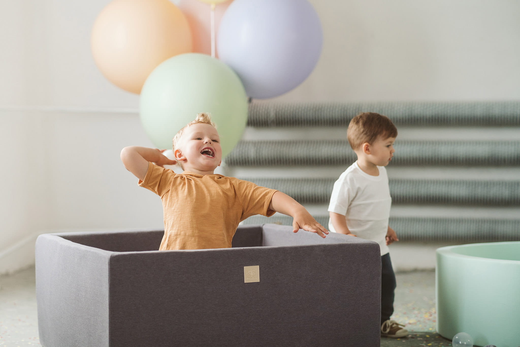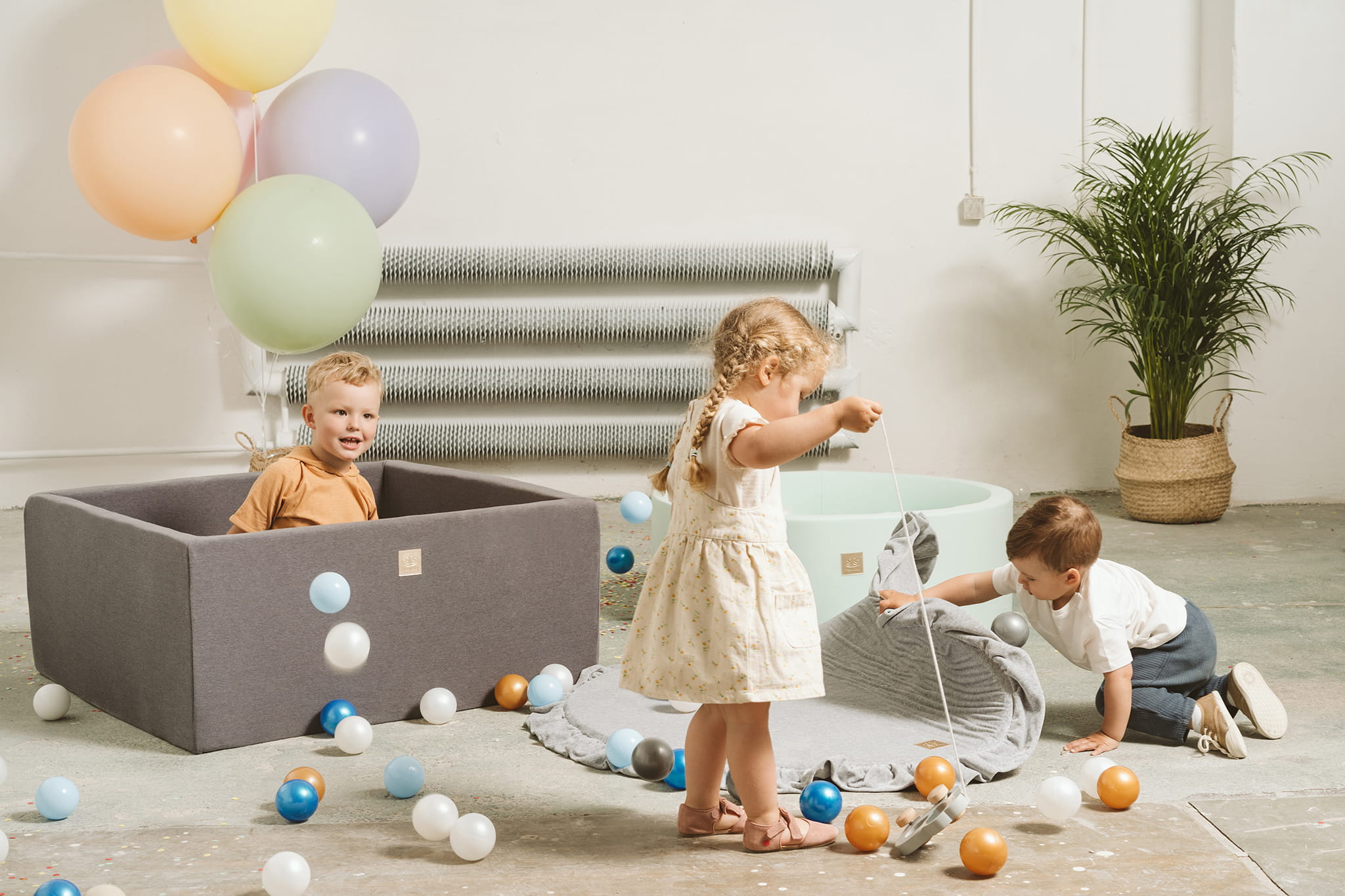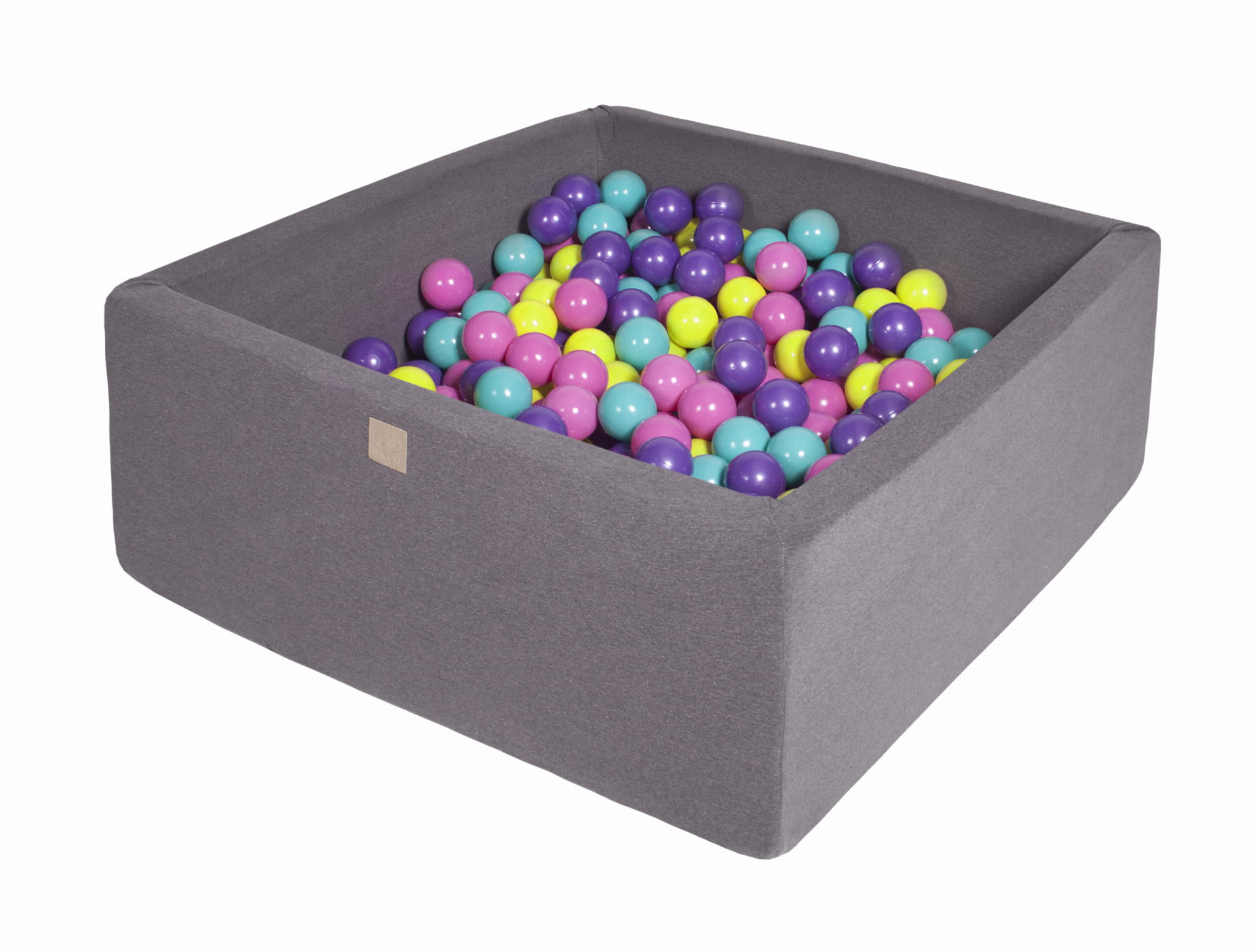Suchy basen kwadratowy w szarym kolorze świetnie sprawdzi się w pokoju chłopca oraz dziewczynki.