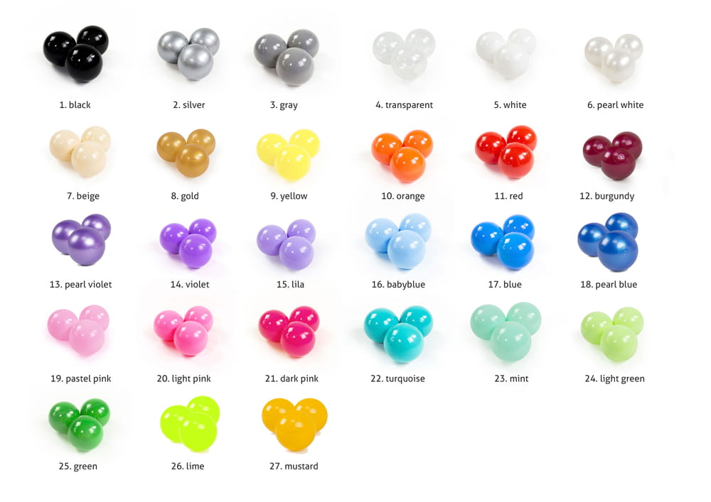 Masz możliwość wyboru spośród aż 27 kolorów piłeczek! Piłeczki występują w zestawach po 50 sztuk, więc w podstawowej opcji możesz wybrać 4 zestawy kolorów. Prosimy o podanie kolorów piłeczek w komentarzu do zamówienia.